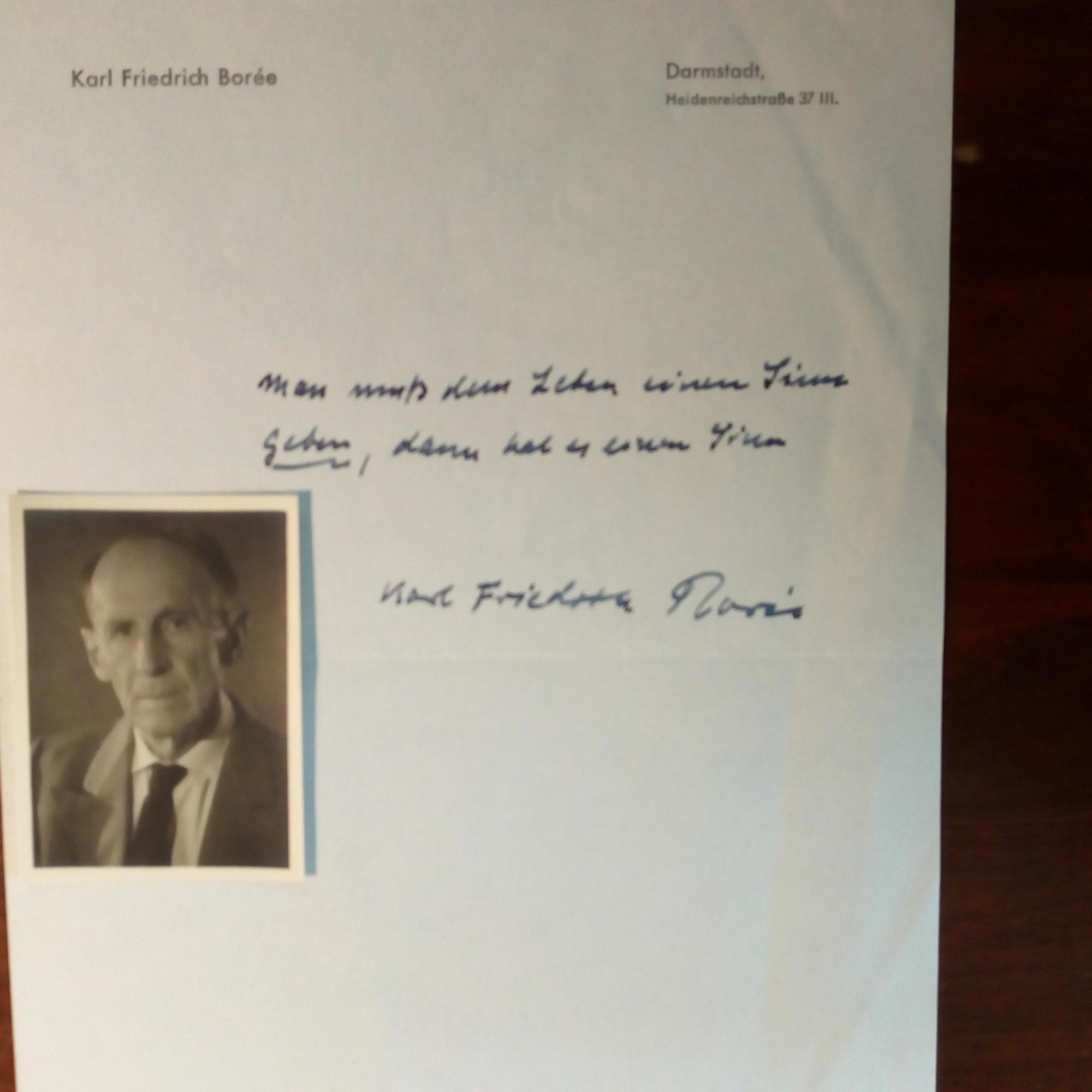 1886-1964, Schriftsteller - Passfoto mit Widm. mit U. auf Rückseite, August 1961. beiliegt 8°-Blatt mit e. Zitat und U., mit Briefkopf. "Man muß dem Leben einen Sinn geben, dann hat es einen Sinn!".