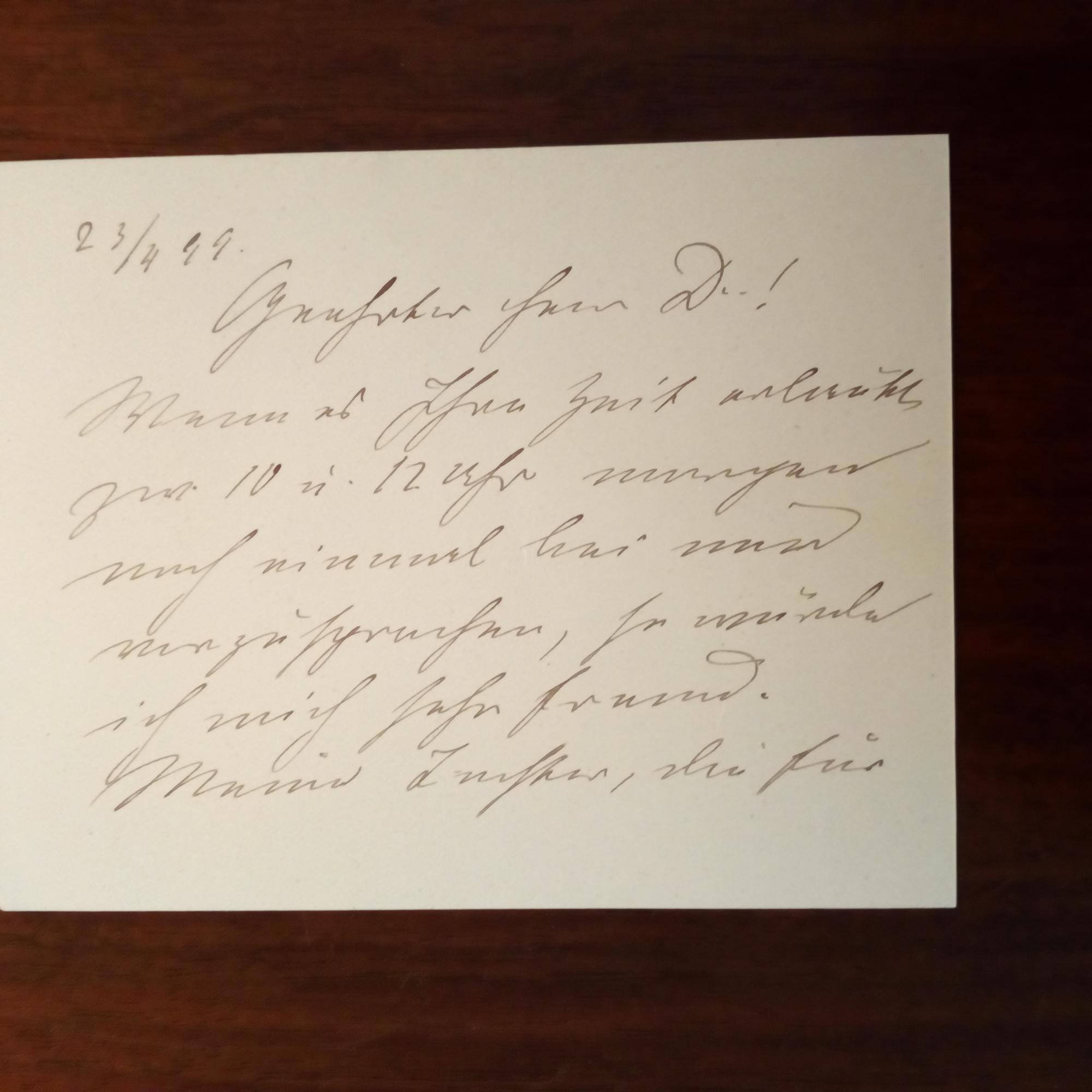1848-1932, Porträtmalerin - E. Briefkarte mit U., 1 ¾ S., (Hamburg) 23.4.1899, mit e. postal. Umschlag. Bittet den Rechtsanwalt und Verleger Felix Bondi (1860-1934) in Dresden, "noch einmal bei mir vorzusprechen...meine Schwester...wird sehr bedauern, Sie nicht zu sehen...".
