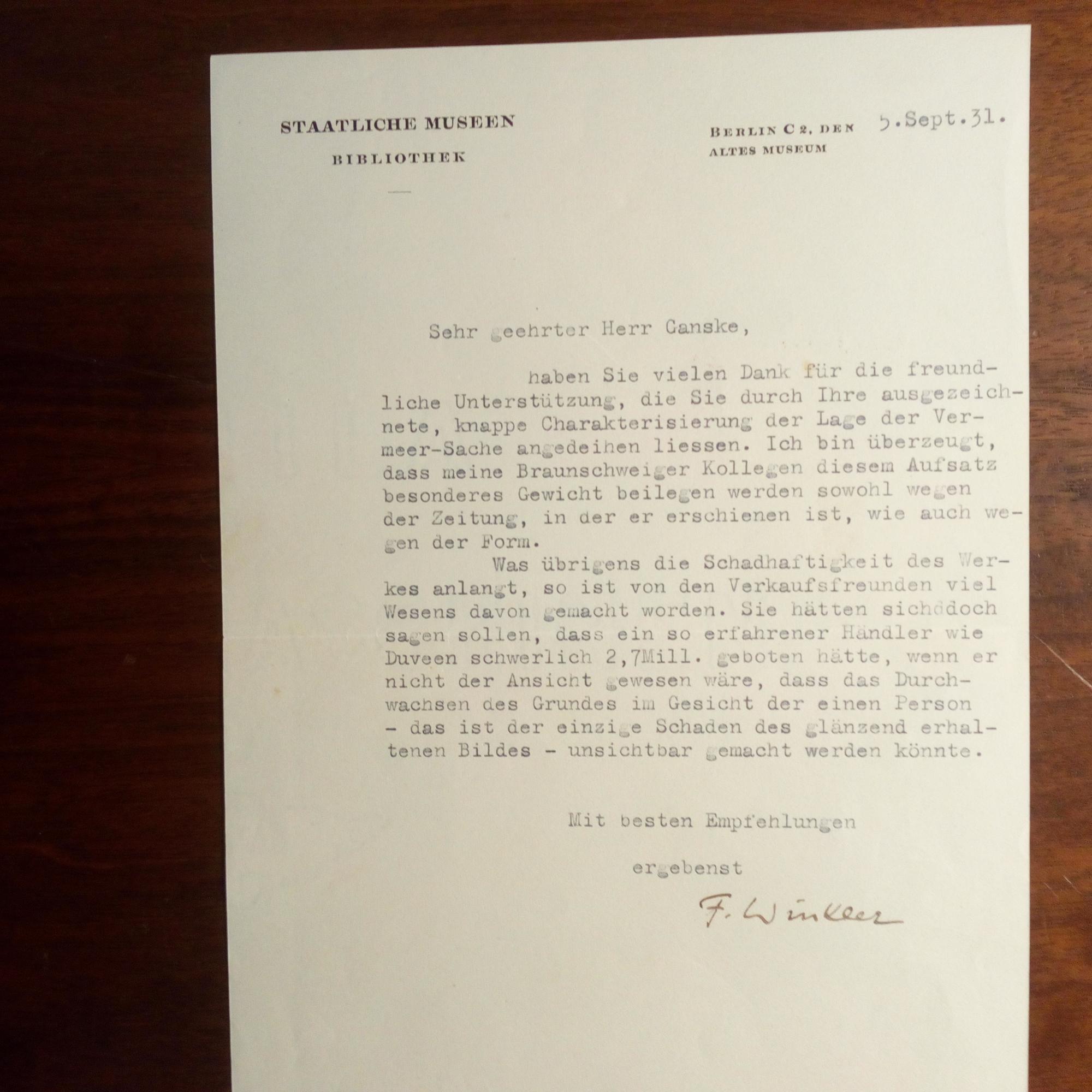 1888-1965, Kunsthistoriker, Dir. des Kupferstichkabinetts in Berlin - Brief mit U., (Berlin) 5.9.1931, 1 S. 8°. Briefkopf der Bibliothek der Staatl. Museen. An den Kieler Verleger Kurt Ganske (1905-79) betr. "Vermeer-Sache": ...Sie hätten sich doch sagen sollen, dass so ein erfahrener Händler wie Duveen schwerlich 2,7 Mill. geboten hätte, wenn nicht...der einzige Schaden des glänzend erhaltenen Bildes unsichtbar gemacht werden könnte...