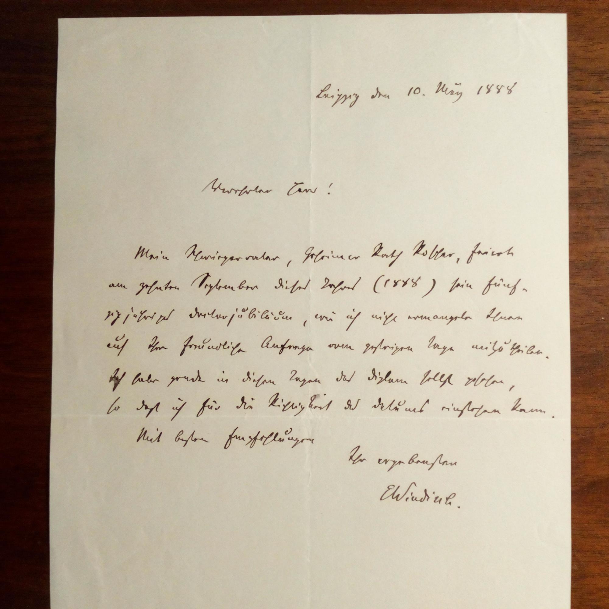1844-1918, Sprachwiss. (Indogermanist), Freund des jungen Nietzsche - E. Br. m. U., Leipzig 10.3.1888, ½ S. 8°. Gibt Auskunft zum 50-jährigen Doktorjubiläum seines Schwiegervaters, des Historikers und Ökonomen Wilhelm Roscher (1817-94).