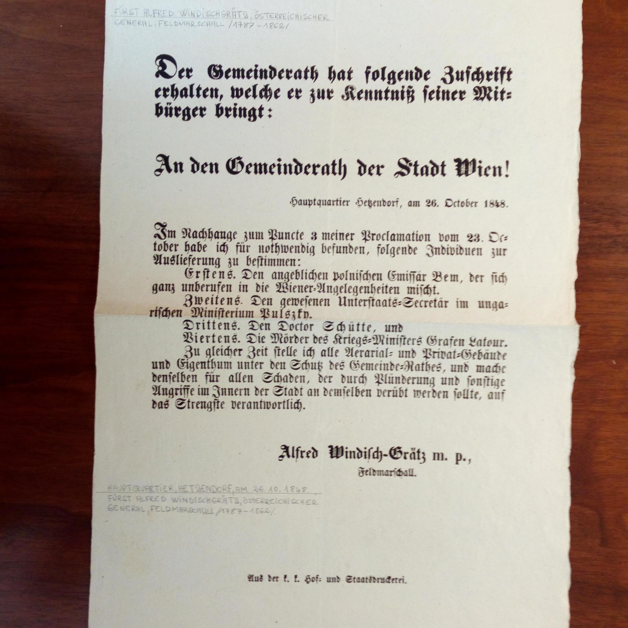 1787-1962, Fürst, österr. Feldmarschall - Gedr. Anschlags-Blatt (gr. folio) des "Wiener Gemeinderates" in s. Namen, 26.10.1848. ...habe ich für nothwendig befunden, folgende Individuen zur Auslieferung zu bestimmen... (Pulszky, Schütte, Bem...). Kl. Bleistift-Beschr.