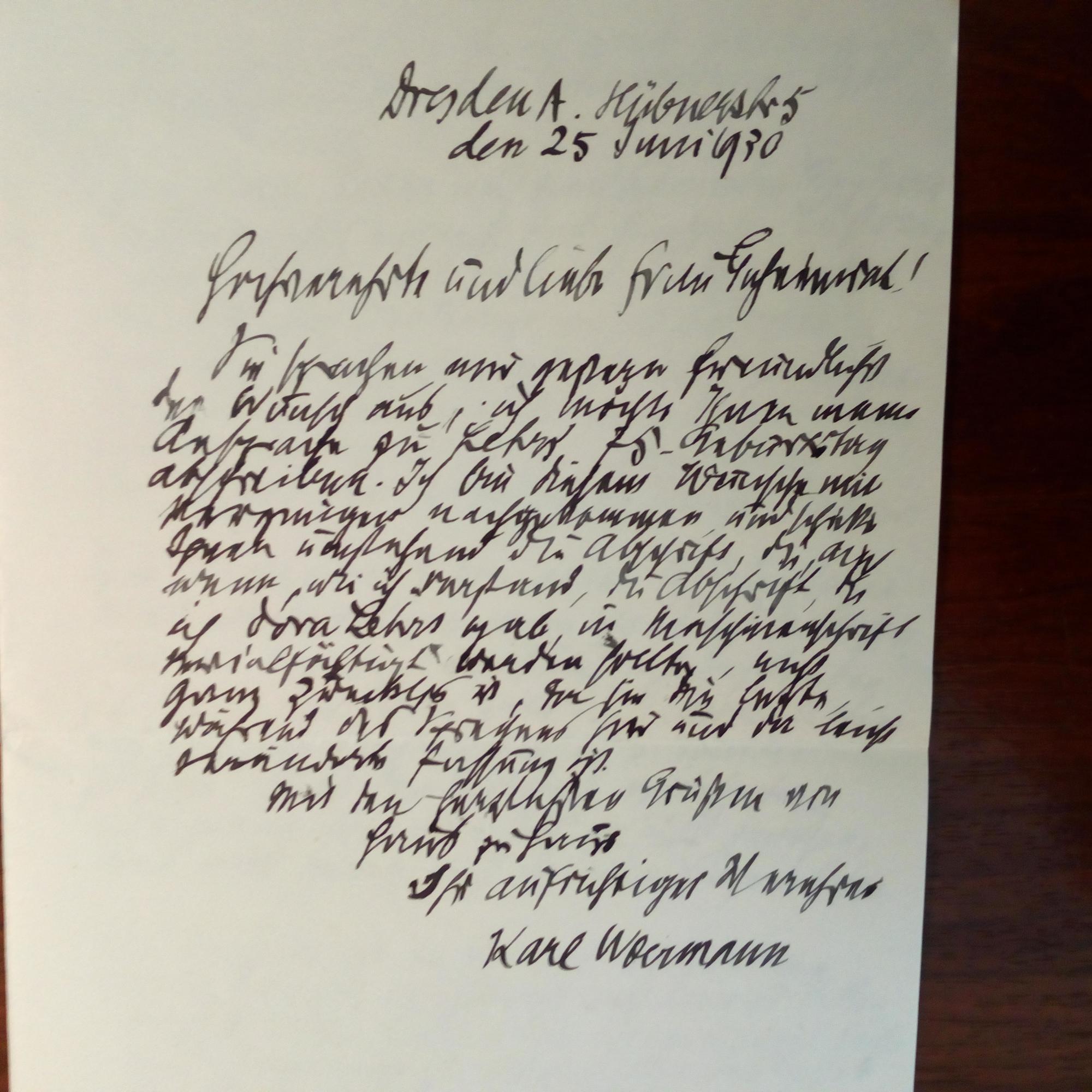 1844-1933, Kunsthistoriker - E. Brief mit U., Dresden 11.3.1894, 1 ½ S. gr. 8°, Briefkopf, leichte Knitterspuren. Als Dir. der königl. Gemäldegalerie an den Radierer und Kupferstecher Carl Mispagel (1865-1930) in Karlsruhe, der ein Bild von Holbein kopieren möchte. Die Genehmigung des Königs könne er zwar einholen, für die Darmstädter Galerie komme aber nur das Original in Frage.