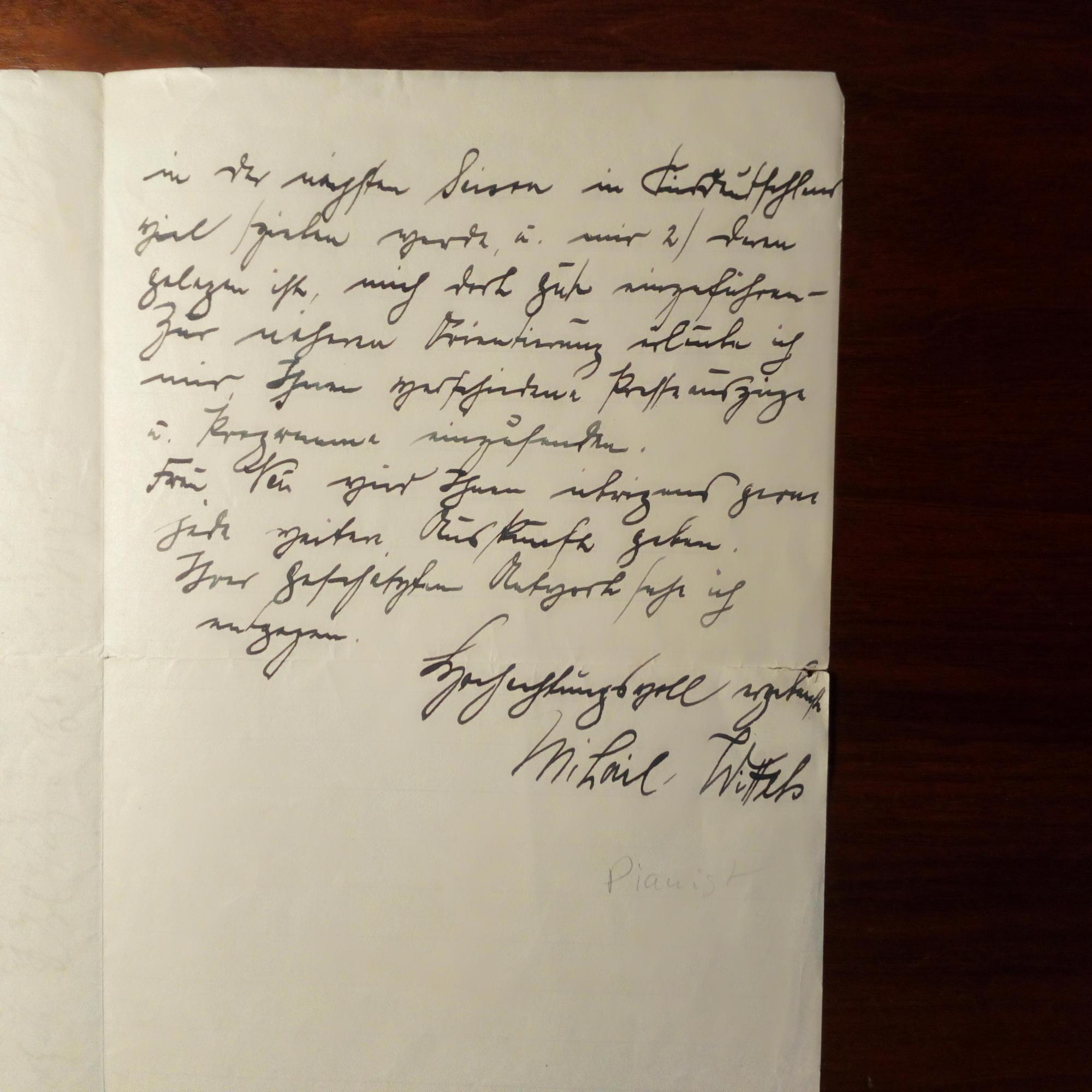 1893-1939, rumän. Pianist - E. Brief mit U., Berlin 14.6.1925, 1 ½ S. 8°, leichte Altersspuren. An den Leiter des Musikvereins Nürnberg: ...dürfte Ihnen von meinen zahlreichen Klavierabenden hier bekannt sein (in Nürnberg erstmalig 6. März 1925). Ich würde nun sehr gerne in der nächsten Saison weiter dort spielen...dass meine Honorarwünsche gering wären...