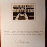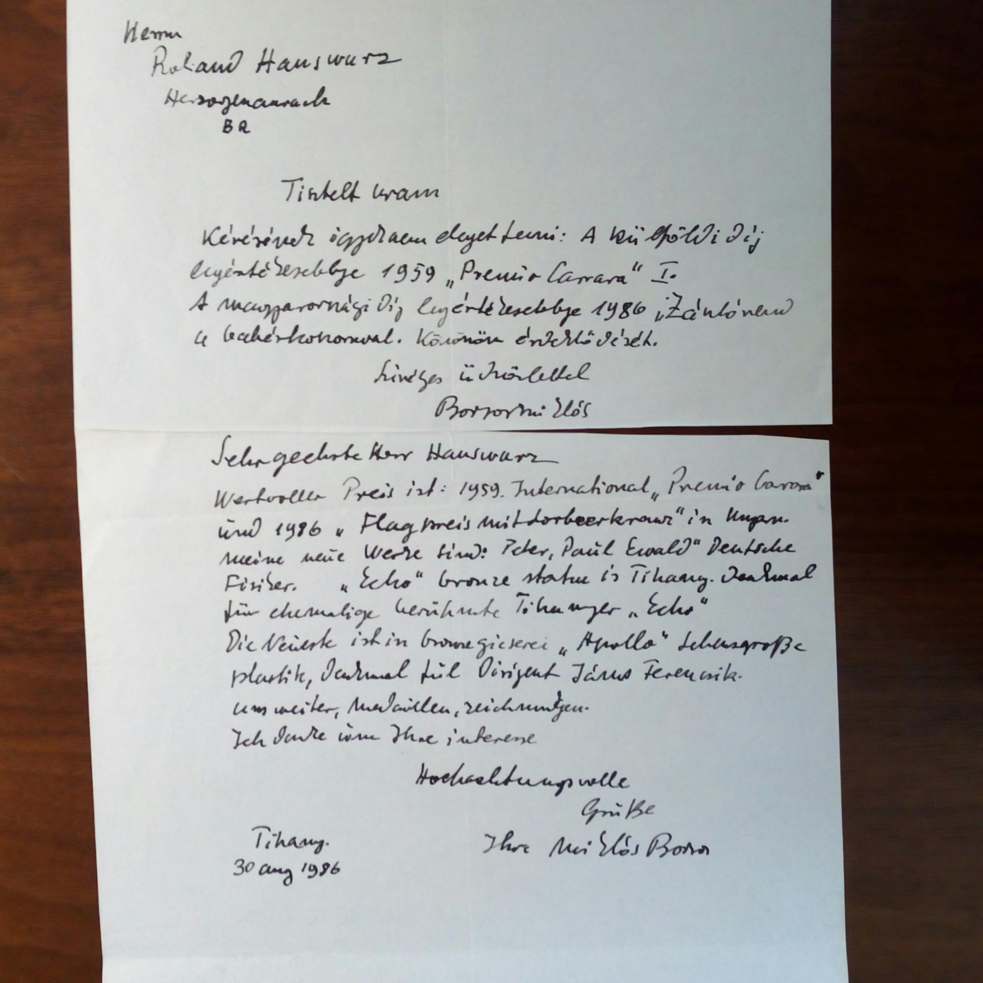 1906-90, ungar. Bildhauer - E. Brief mit U., Tihany 30.8.1986, auf ca. ¾ S .4° beschn., deutsch. Mit e. Ergänzungsblatt (dieses auf Ungarisch) mit U., mit e. postal. Umschlag (U. im Abs.). Gibt dem Sammler Roland Hauswurz in Herzogenaurach biograph. Auskünfte.