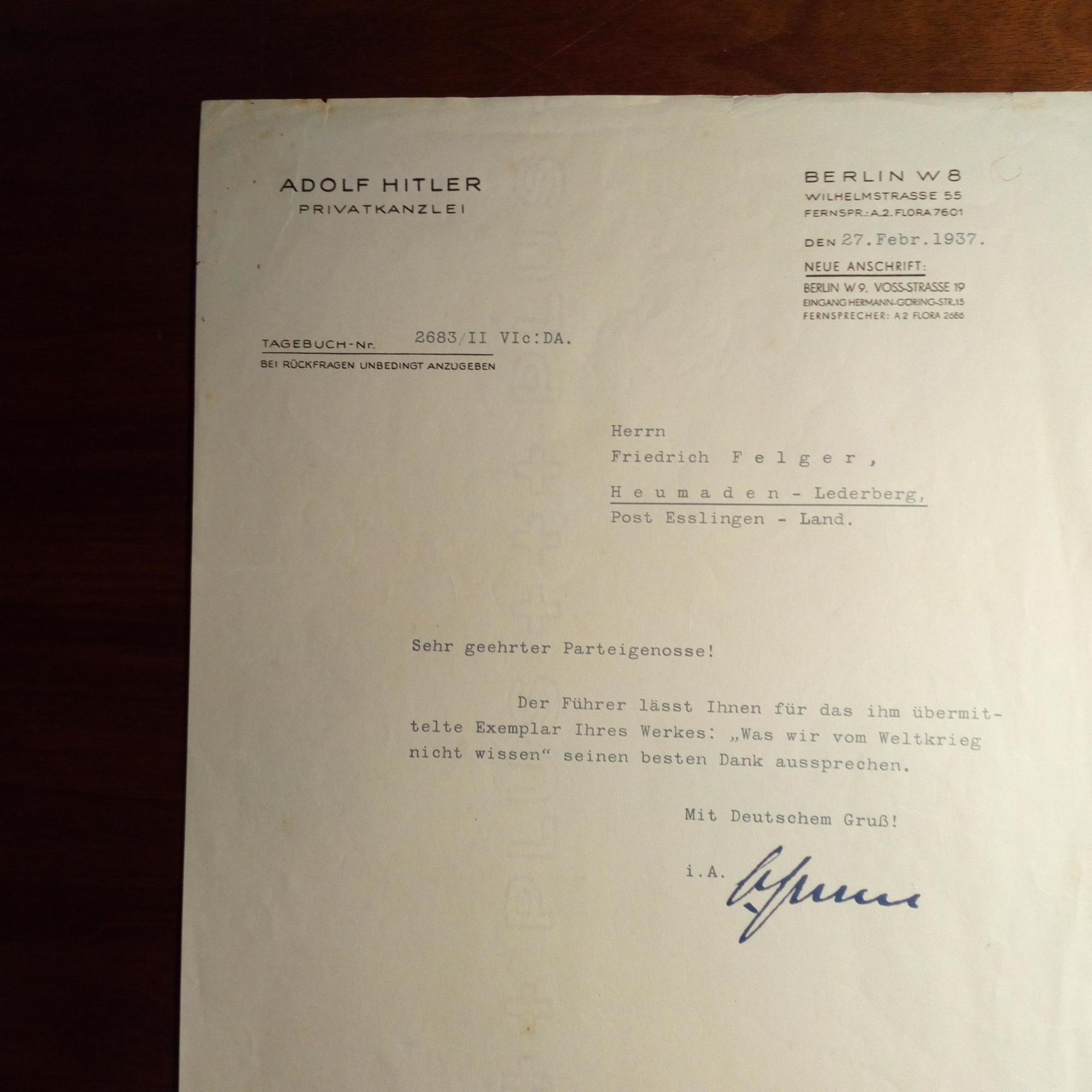 1902-89, Sekretär Hitlers, Bruder von Martin B. - Br. m. U., (Berlin) 27.2.1937, ¾ S. 4°. Br.kopf von Hitlers Privatkanzlei. Dankt in dessen Namen dem Leiter der "Weltkriegsbücherei" in Stuttgart Friedrich Felger (1882-1960, Maler, Schriftsteller u. Historiker) für das von diesem hrsg. Buch "Was wir vom Weltkrieg nicht wissen".
