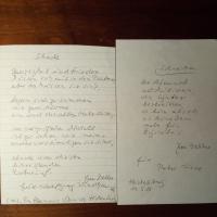 1923-2022, Schriftstellerin - 2 8°-Blätter, je mit e. Gedicht "Schreiben" (7 Z., mit Widm. und U., Heidelberg 11.5.1986) und "Schade" (4 Str. à 3 Z., "aus 'Ein Stein aus Davids Hirtentasche'", mit Widm. und U.). Beiliegen 2 Drucke von Gedichten und Verl.prospekt, je mit U.