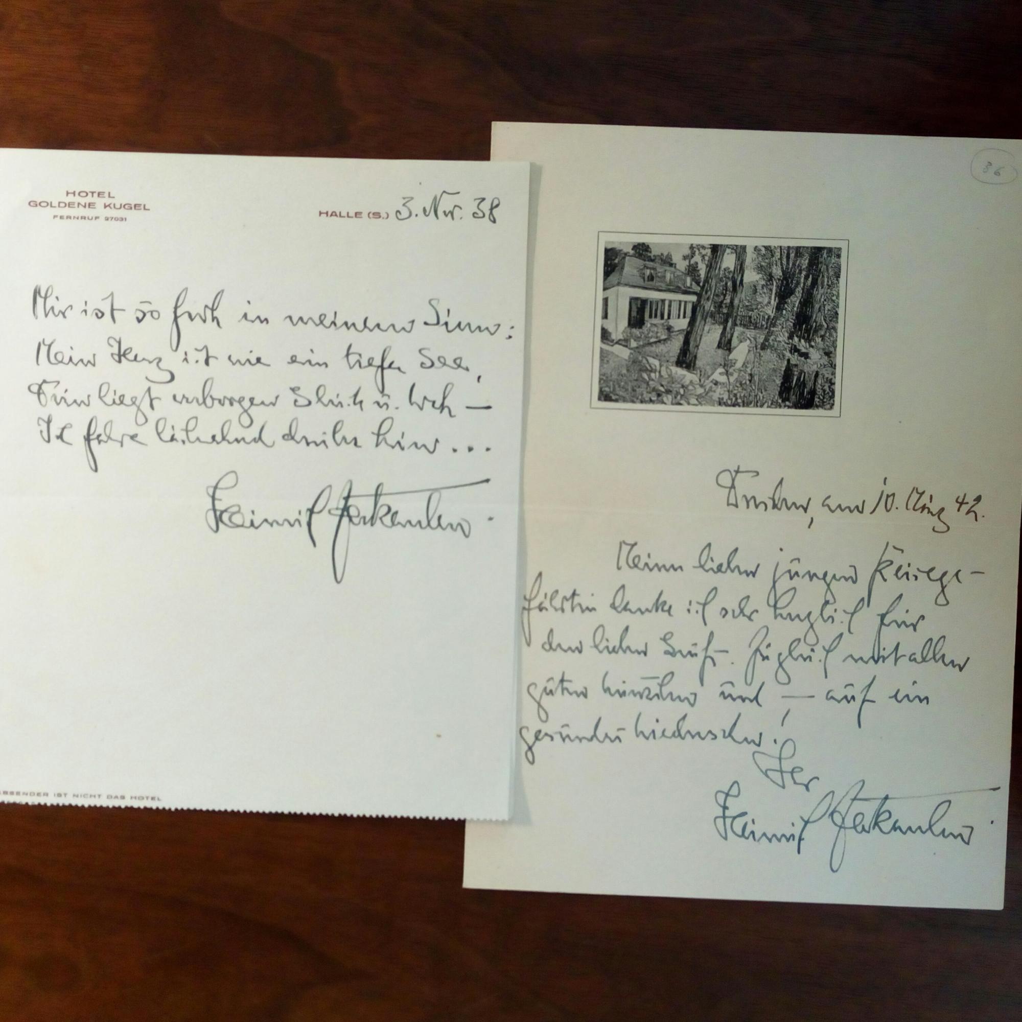 1892-1954, Schriftsteller - E. Brief mit U., Dresden 10.3.1942, am Kopf Druck einer Grafik seines Hauses. Dankt "Meiner lieben jungen Reisegefährtin" für Grüße. Auf nächstem Blatt Faksimile eines e. Albumblattes. Beiliegen: E. Vierzeiler mit U., 3.11.1938, Briefkopf des Hotels "Goldene Kugel" in Halle und Porträt (nach einer Zeichnung von E. Hase) mit U. und D. 10.5.1923, als e. postal. Ansichtskarte mit U. an einen Lehrer in Berlin, sowie "Reise-Brotmarken".