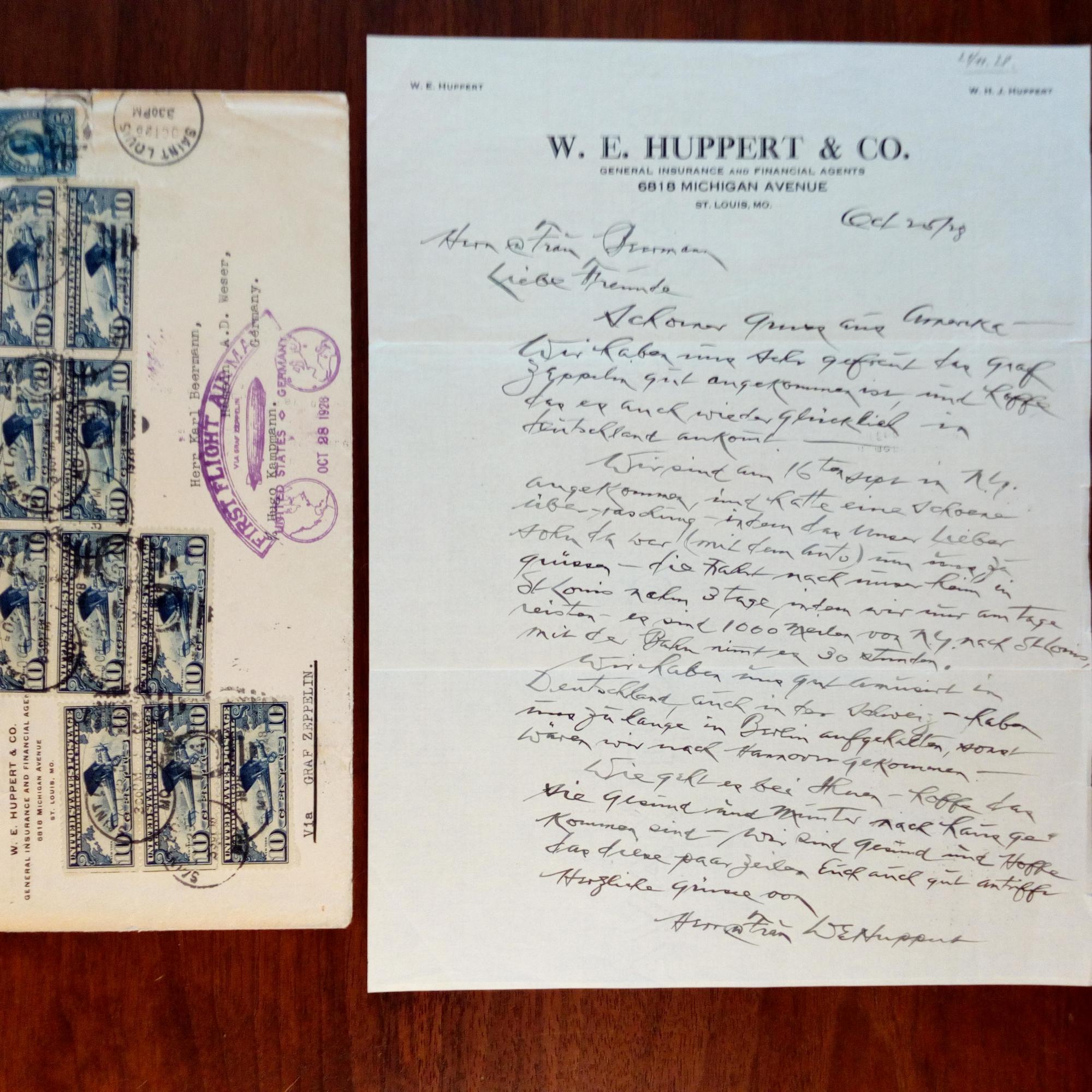 E. Brief mit U., St. Louis 25.10.1928, 1 S. 4°. Der Versiche-rungsmakler Huppert (Briefkopf seiner Fa. in St. Louis) erzählt nach der Rückkehr auf Deutsch von seiner Europa-Reise, dabei der erste Atlantik-Flug des "LZ 127"-Luftschiffes. Umschlag mit interessanten Briefmarken und den 3 Stempeln: Post vom 25.10., "First Flight Air Mail" vom 28.10. ("5 AM") und Ankunft in Friedrichshafen am 7.11.1928.
