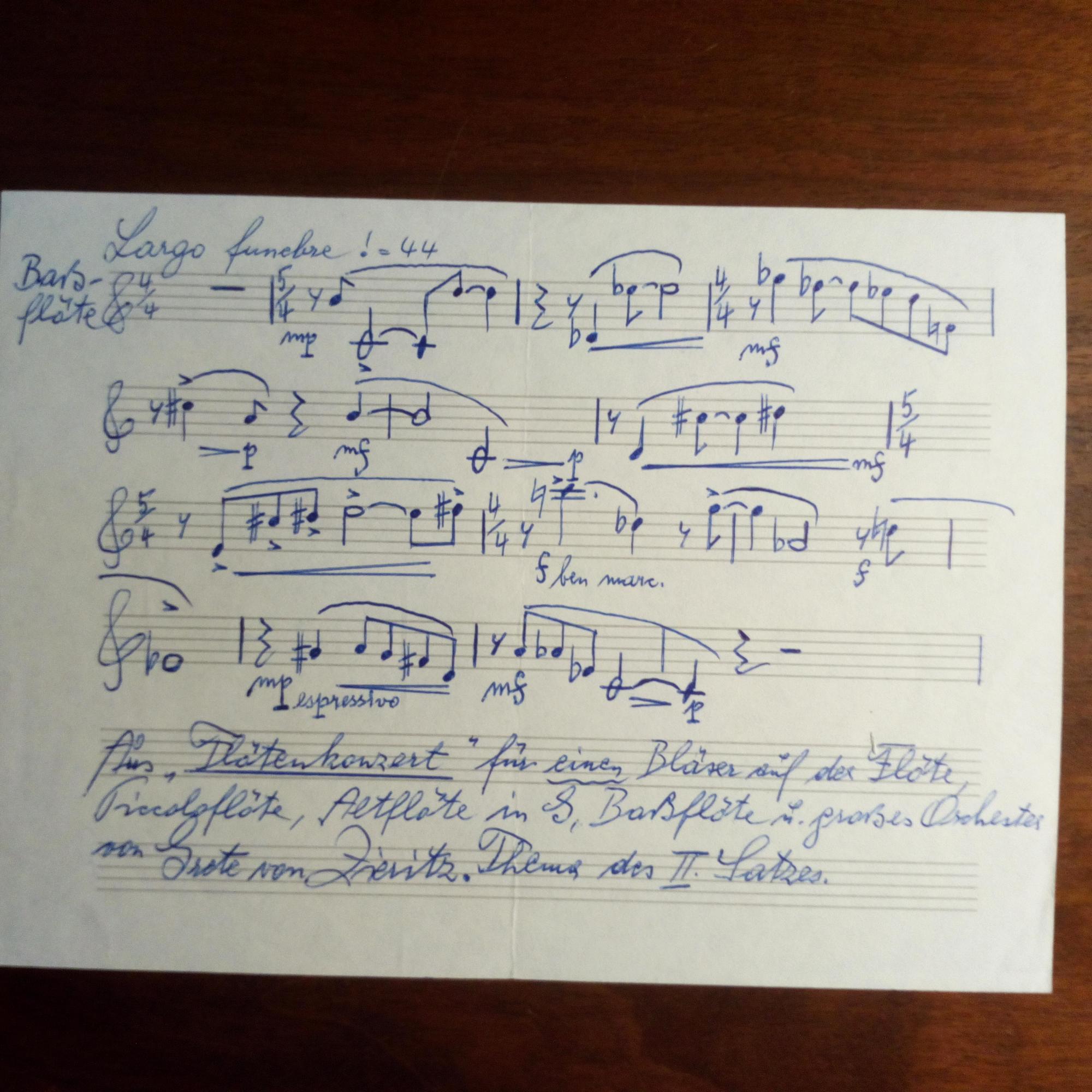 1899-2001, österr. Komponistin - 8°quer-Noten-blatt m. 4 e. Notenz. (11 Takte), e. Beschriftung u. U. "Aus ,Flötenkonzert' für einen Bläser auf der Flöte ... Thema des II. Satzes.". Beiliegt Biographieblatt m. U. auf Abbildung einer Büste von ihr. Dazu e. Br.karte m. U., (Berlin) 14.3.1976, m. e. postal. Umschlag. Dankt für Geb.wünsche.