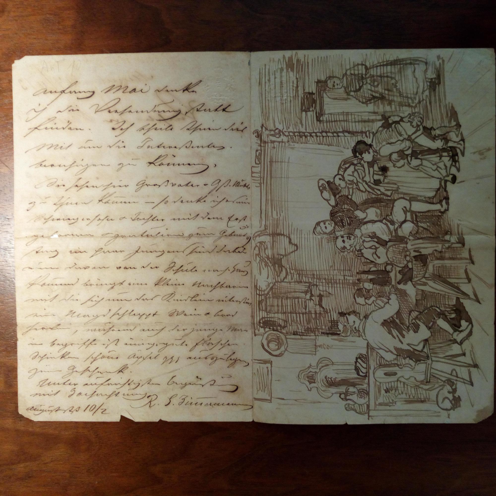 1815-93, Maler - E. Brief mit U., München 14.4.1873, 3 S. gr. 8°, gepr. Enblem am Kopf, Altersspuren. An einen Auftraggeber mit Details zu einem geplanten Bild (Familienszene). Die 3. Seite ist eine detaillierte e. Entwurfszeichnung.