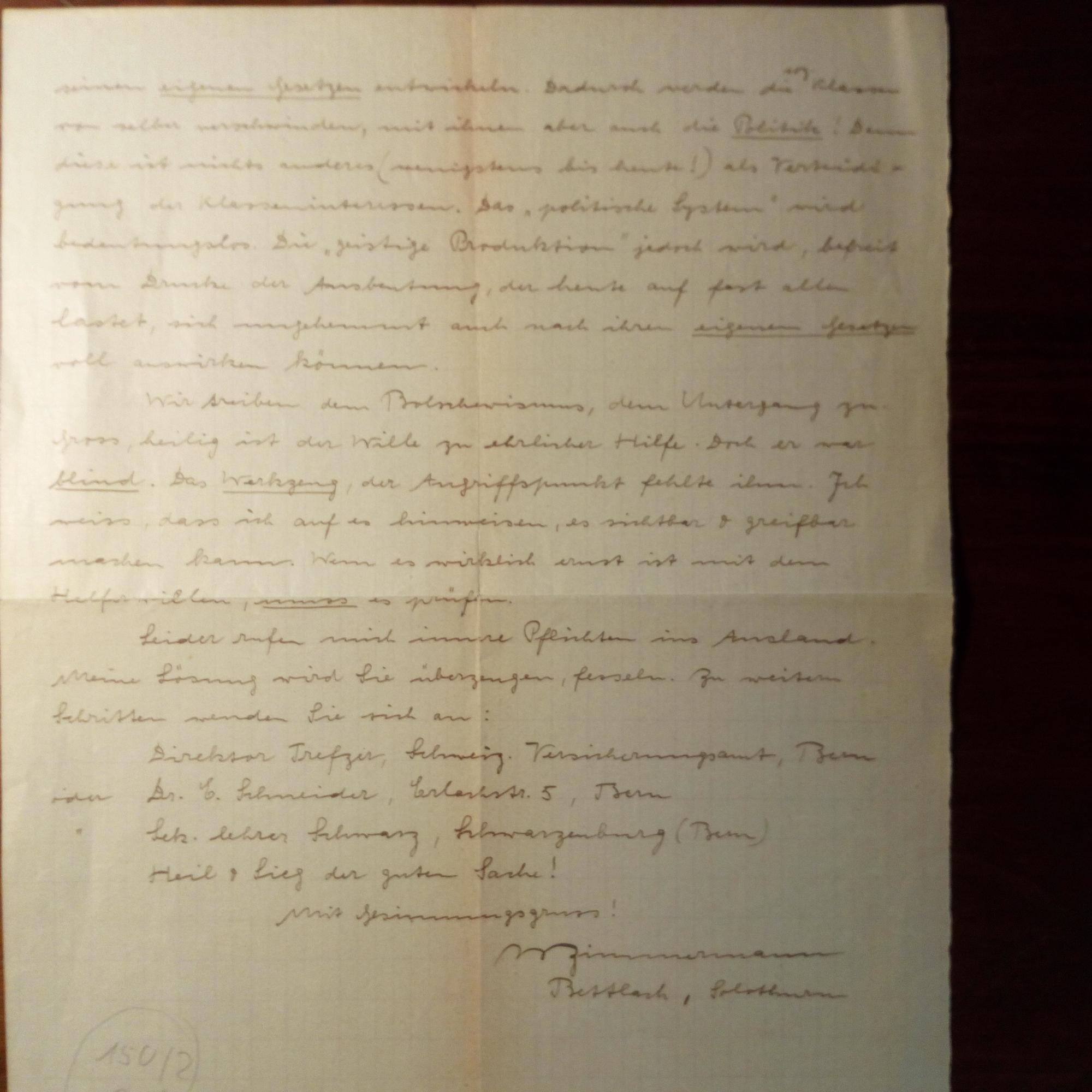 1893-1982, schweiz. Lebensreformer. Freiwirtschaftler und Schriftsteller - E. Brief mit U., Bettlach 4.5.1919, 2 S. 4°, kl. Schrift. An den schweizer Sozialwissensch. Roman Boos (1889-1952): ...Soeben lese ich Aufruf "An das Schweizervolk"...Wir müssen sichtbare, konkrete Ziele setzen, allerdings vollständig im Sinne des natürlichen Organismus. Der "Sozialstaat" der Kommunisten wäre das Gegenteil... Bezieht sich auf sein beiliegendes Büchlein "Was ist Sozialismus", Francke-Verl., Bern 1919. Beiliegt Karte mit U. und kl. Druck-Pfo., mit postal. Umschlag (1960).