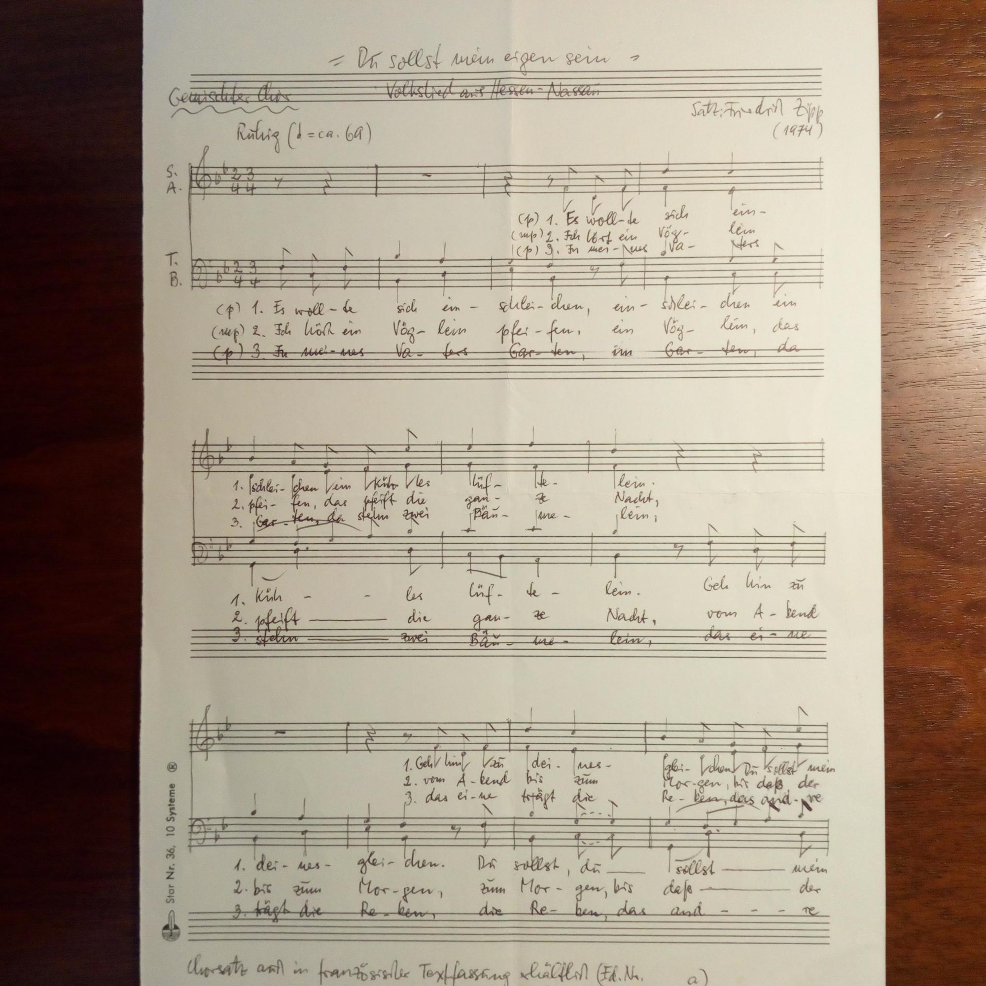 1914-97, Komponist - E. Manuskript m. U. u. Jahr 1974 am Kopf, 2 S. 4°. Noten und Text von "Du sollst mein eigen sein. Volkslied aus Hessen-Nassau". Beiliegt Karte m. e. Dank für Geb.wünsche u. U.