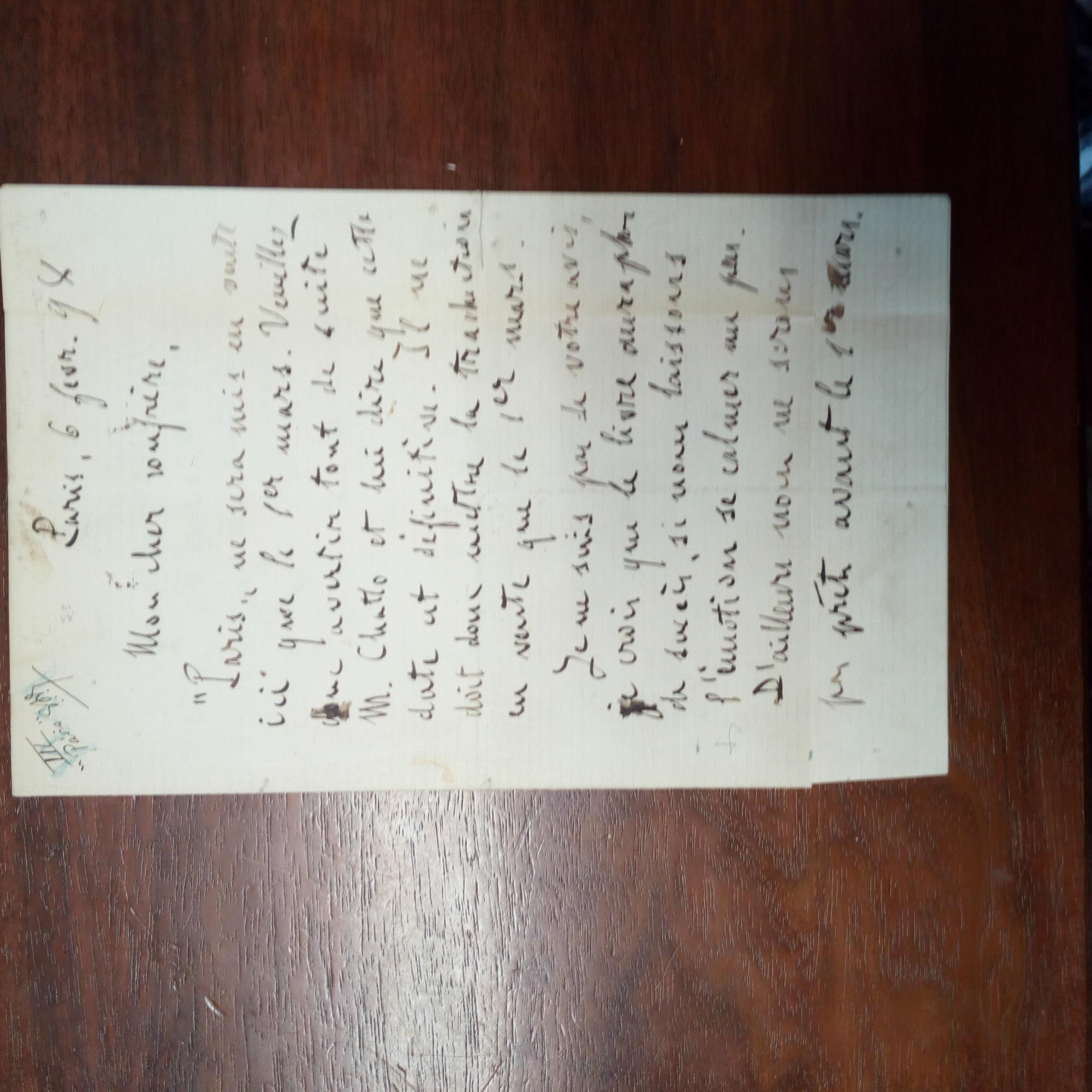 1840-1902, frz. Schriftsteller - E. Brief mit U., Paris 6.2.1898, 2 S. 8°, Notizen des Adr., Gebr.spuren. An einen "Confrère": Sein Roman "Paris" (3. Teil des Zyklus "Trois Villes") werde erst am 1. März in Frankreich ersch. Der engl. Verleger Andrew Chatto (1840-1913) dürfe die Übersetzung erst dann in den Handel bringen. Der Roman werde mehr Erfolg haben, "si nous laissons l'emotion se calmer un peu...".