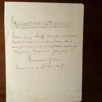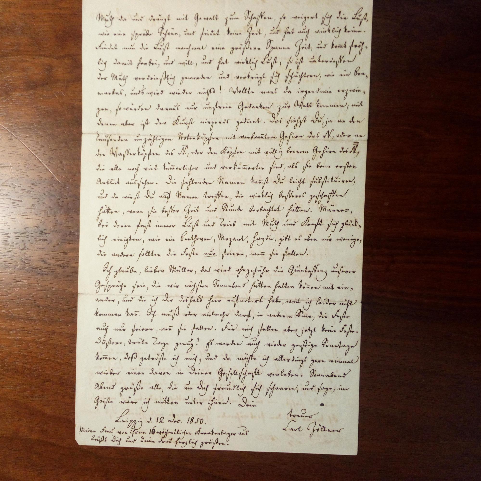 1800-60, Chor-Dirigent und Komponist - 1. E. Widm.gedicht mit U. auf Rückseite des losen Titelblattes von "Zehn Lieder und Gesänge" (ersch. 1844). "An Freund Zeitler/-und darum wollt' ich sie Euch weihn:/ Dass sie für manche schöne Stunden,/ Die Ihr vielleicht durch sie gefunden,/Ein freundlich Denkmal möchten sein/". Altersspuren. 2. Brief mit U., Leipzig 11.12.1850, 2 S. 8°, kl. und dicht geschr., kl. Falteinrisschen. An den befreundeten Musikdirektor Müller: Heitere Betrachtung zum Verhältnis von Mut und Lust im künstlerischen Schaffen.