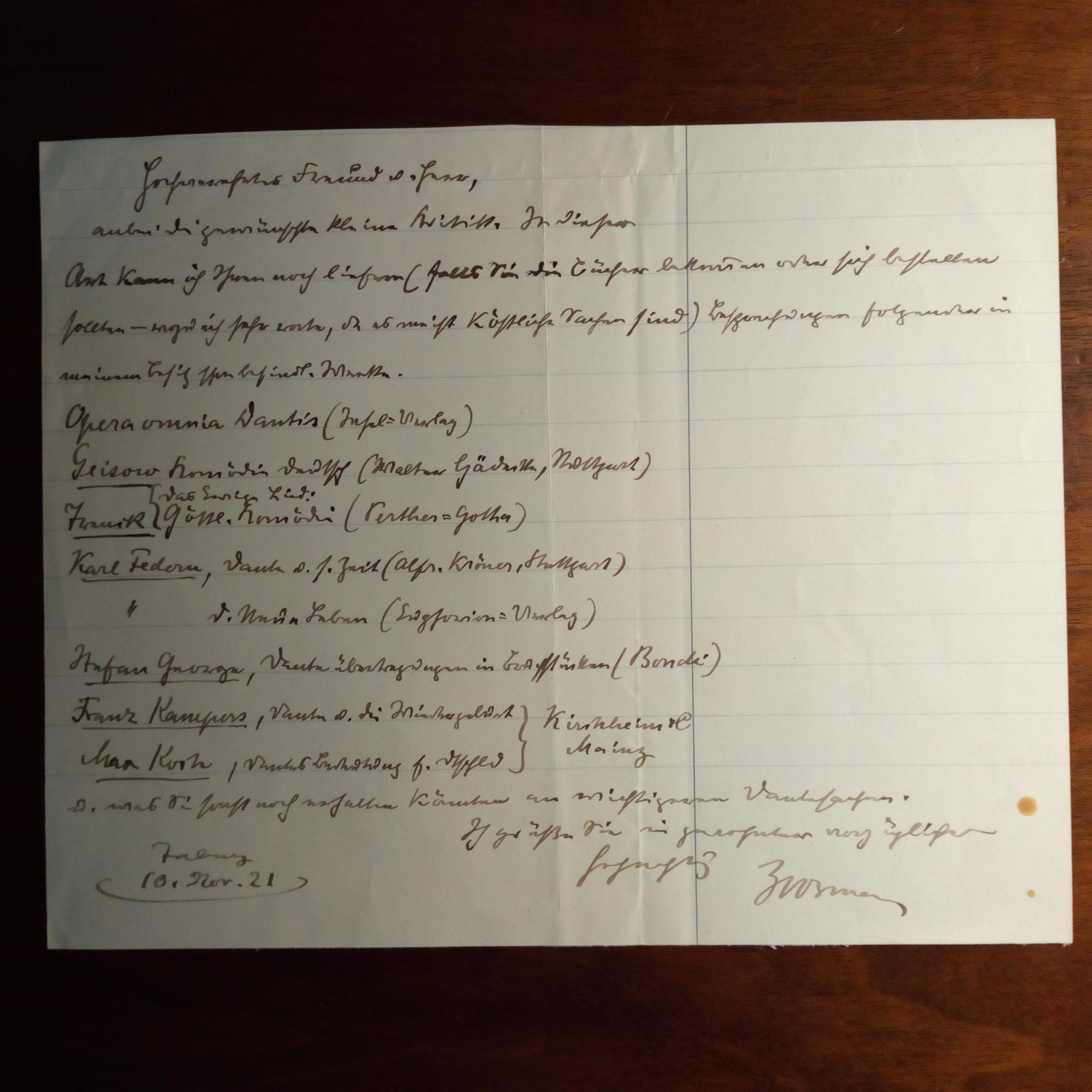 1863-1934, Schriftst. - E. Br. m. U., 10.11.1921, 1 S. ca. gr.8° quer (beschn.), kl. Fleck. Bietet Kritiken zu versch. Werken über Dante an (Karl Federn, Franz Kampers, Stefan George...).