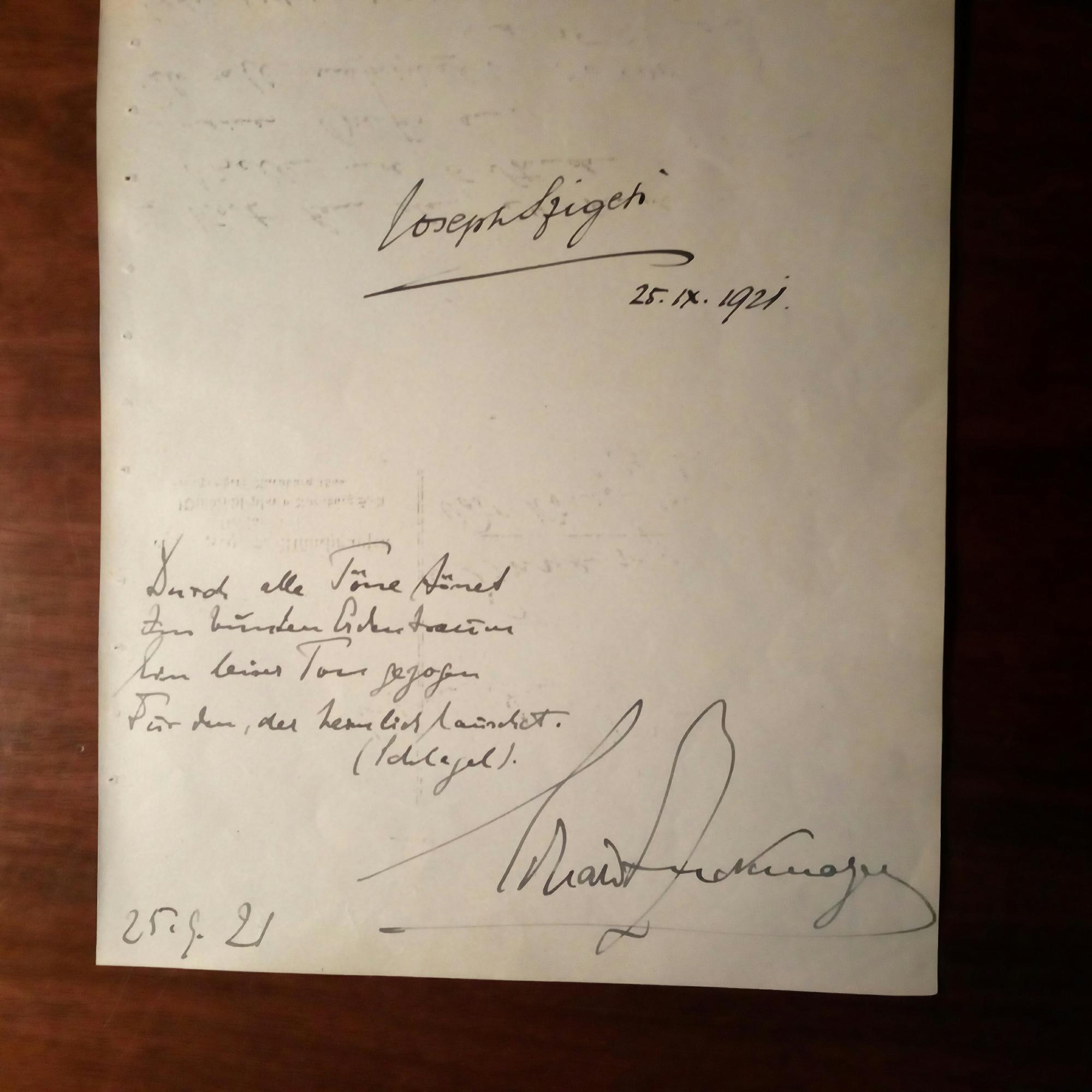 1890-1972, Pianist, Komponist und Musikwissenschaftler - kl. 4°-Blatt mit e. Zitat (4 Z., "Durch alle Töne tönet/ Im bunten Erdentraum...", von Schlegel), U. und D. 25.9.1921. Darüber U. und D. des Violonisten Joseph Szigeti (1892-1973), etwas fleckig.