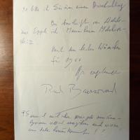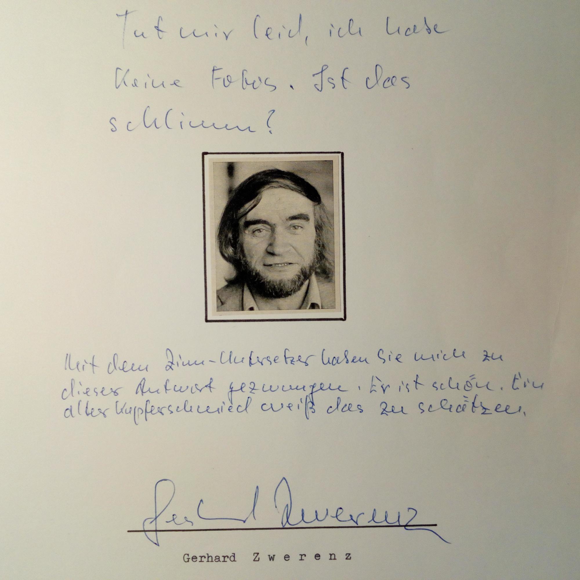 1925-2015, Schriftsteller - 1. Brief mit e. Anmerkungen und U., 30.10.1966, 2 S. 4°, dicht geschr., gel. An den Schriftleiter des Scherz-Verlages in München Heinz Klüter: Inhaltsreich betr. Kritiken zu seinem neuen Roman "Casanova": Verzögerungen bei der Auslieferung, die Spiegel-Bestsellerliste, lehnt ein Drama über den Stoff ab, Lesungen und bittet um Geld, da er nun "fortwährend unterwegs" sei. 2. Pfo. (nach seiner Büste von Antje Michel) mit U. Dazu e. Kurzbrief (an Sammler) mit U., (Offenbach) 12.10.1977, Abs.stempel. 3. E. Mitt. und U. auf 4°-Blatt mit mont. kl. Presse-Foto. Beiliegt Zeitschrift mit Ankündigung einer Lesung im "Autonomen Kulturzentrum" Würzburg am 18.4.1989 aus "Soldaten sind Mörder" und Presseartikel dazu. 4. Brief mit U., (Schmitten im Taunus) 20.2.1991, ½ S. 4°. An Fleitmann: ...Erfahrung läßt sich leider kaum vermitteln, außerdem sind wir, die aus dem Krieg Antimilitarismus folgerten, leider eine Minderheit... 5. Karte mit e. Zitat und U., 3.12.1992. "Das Prinzip der Grenzüberschreitungen in Richtung Humanität tut not...", mit e. postal. Umschlag.