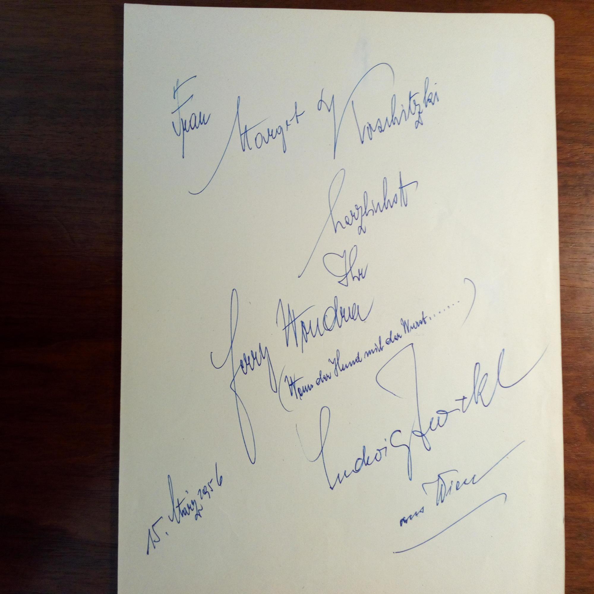 1906-75, österr. Zitherspieler und Schauspieler - 4°-Blatt m. U. u. e. "aus Wien". Darüber Widm., U. und e. "Wenn der Hund mit der Wurst...", 15.3.1956, von dem österr. Schauspieler Ferry Wondra (1905-76). (Traten als Kabarett-Duo auf).