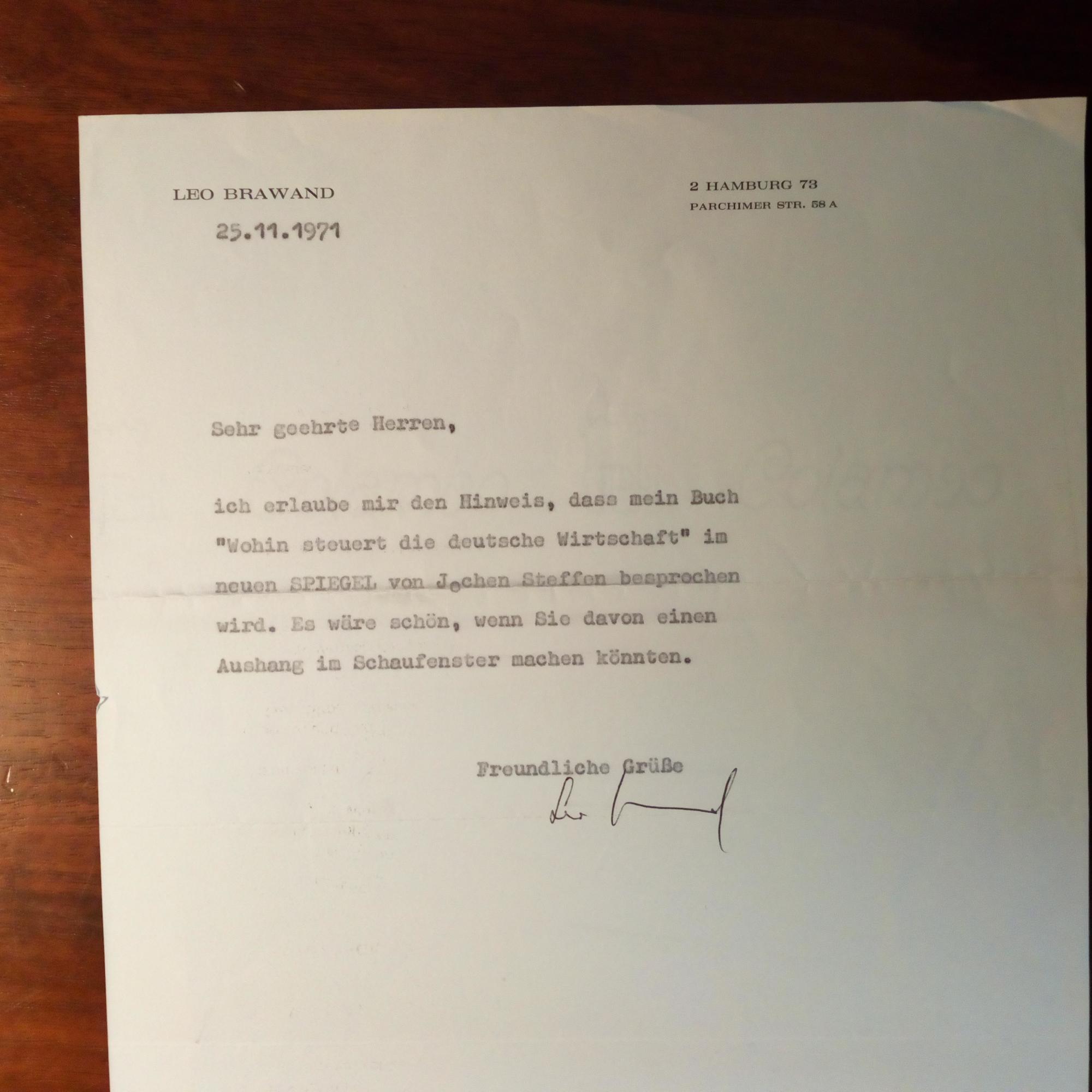 1924-2009, Journalist und Publizist - Br. m. U., (Hamburg) 25.11.1975, ½ S. 4°, Br.kopf. ...dass mein Buch "Wohin steuert die deutsche Wirtschaft" im neuen SPIEGEL ... besprochen wird ... wenn Sie davon einen Aushang im Schaufenster machen könnten...