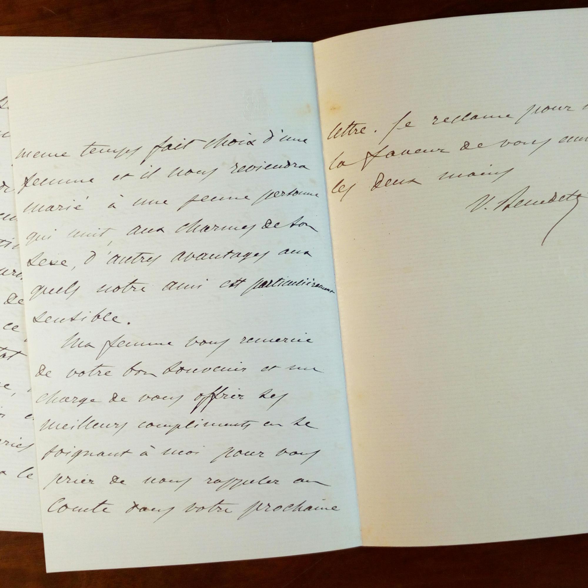 1817-1900, frz. Diplomat, Botschafter in Berlin - E. Br. m. U., Berlin 8.1.1867, 6 ½ S. 8°, gepr. Emblem am Kopf. An eine "Chère Comtesse" betr. geplantem Treffen, seinen Reisen und ausführlich über sein Privatleben.
