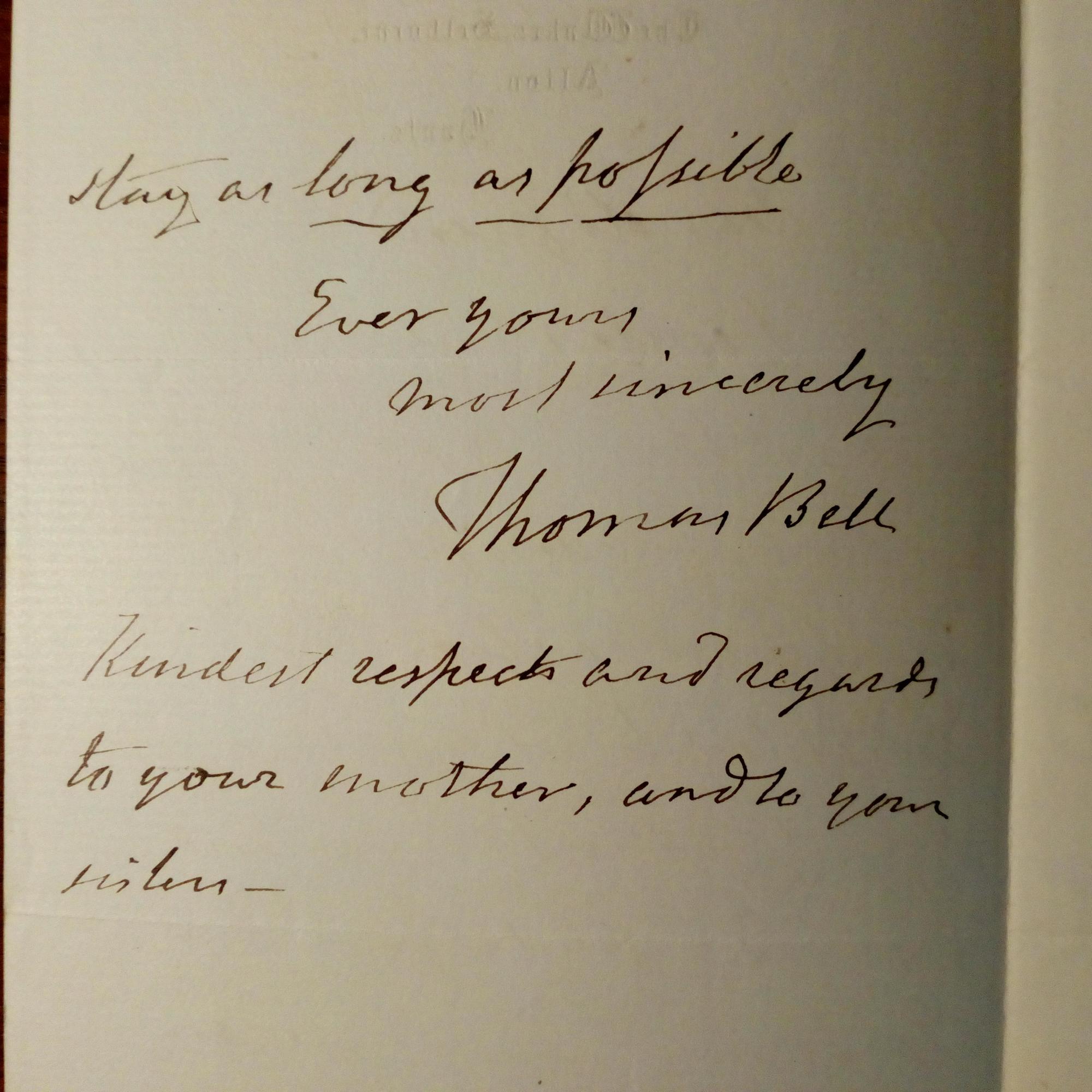 1792-1880, brit. Zoologe - E. Br. m. U., Alton o. J., 1 ¾ S. 8°, Adr.briefkopf, schw. Rand. Adressat wie vor: ...Just send a post card to say when and where ... to have the great pleasure of meeting you...