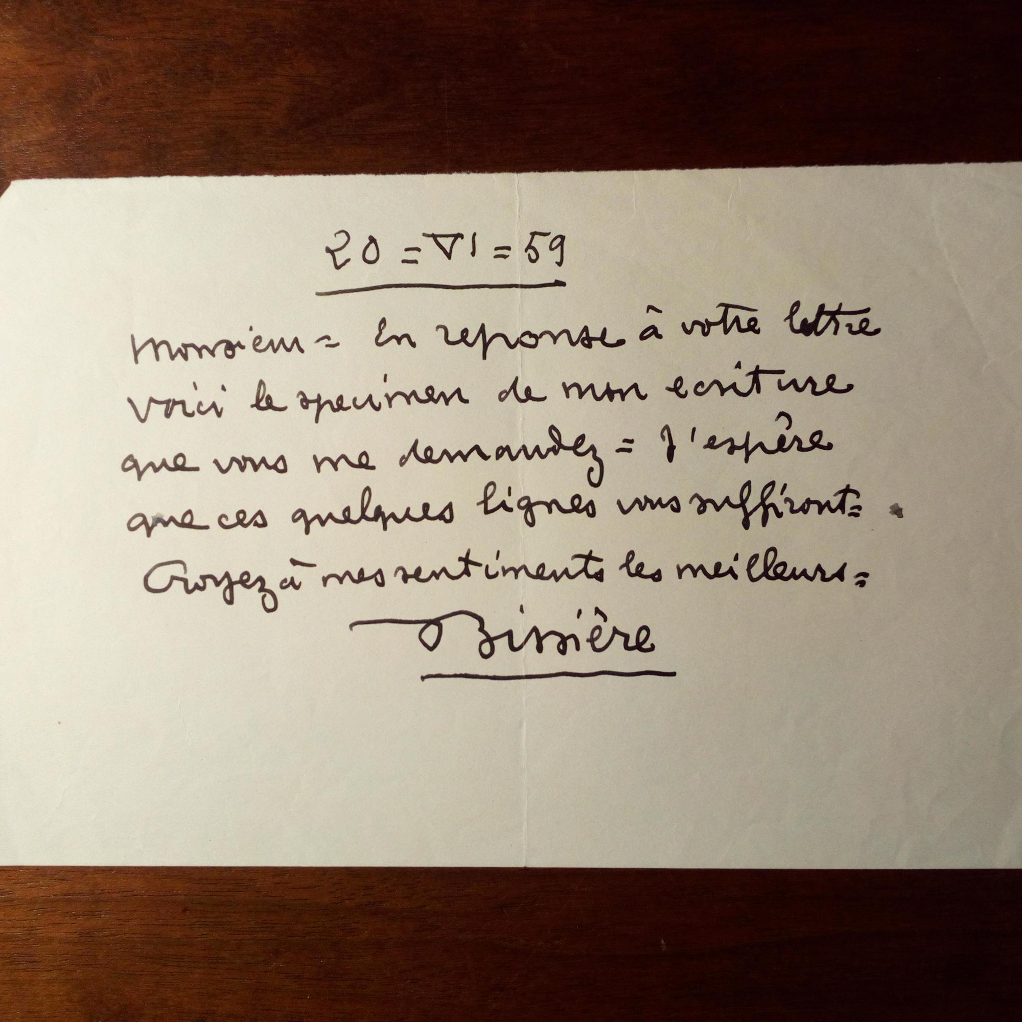 1888-1964, frz. Maler - E. Br. m. U., 20.6.1959, 1 S. 8° quer. An einen Graphologen, der ihn um eine Schriftprobe gebeten hatte: ...J'espère que ces quelques lignes vous suffisont...