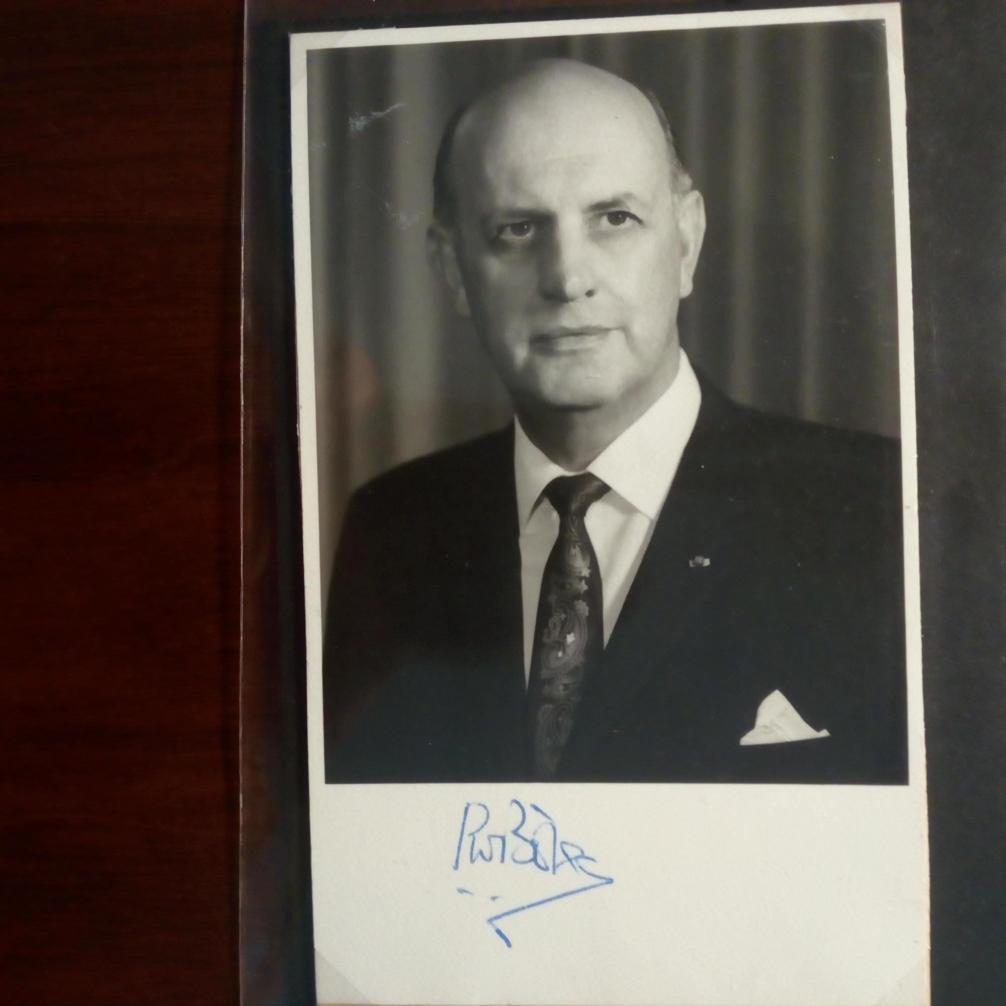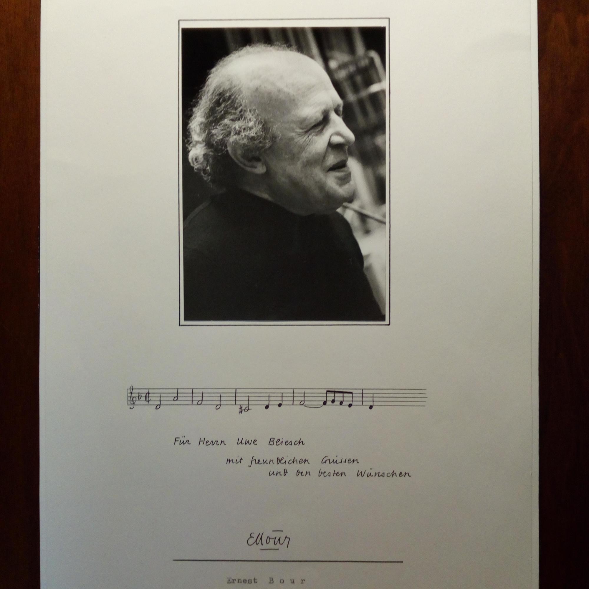 1925-2016, frz. Dirigent und Komponist - Pfo. (Hochglanz, um 1980) mit E. und U. Beiliegt Karte mit späterem mont. kl. Farb-Pfo. (auf der Bühne) mit Widm. und U.