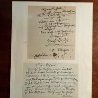 1834-1917, Maler - E. Br. m. U., 1 S. kl.4°, mont. auf 4°. An einen Kunsthändler betr. des Verkaufs eines seiner Gemälde nach England. Auf Rückseite mont. sind je Kurzbr. m. U. in ähnl. Angelegen-heiten von den Malern Theodor Rocholl (1854-1933), dieser m. D. 3.4.1905, und Hugo Mühlig (1854-1929).