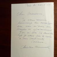 1904-71, frz. Malerin und Graphikerin, Gattin von Henri Goetz - E. Br. m. U., Paris 24.5.1969, ¾ S. 8°, m. e. postal. Umschlag. Dankt Eckhard Goldberg in Malmö (Schweden) für zugesandte "monotypes": ...J'en ai été très sensible...