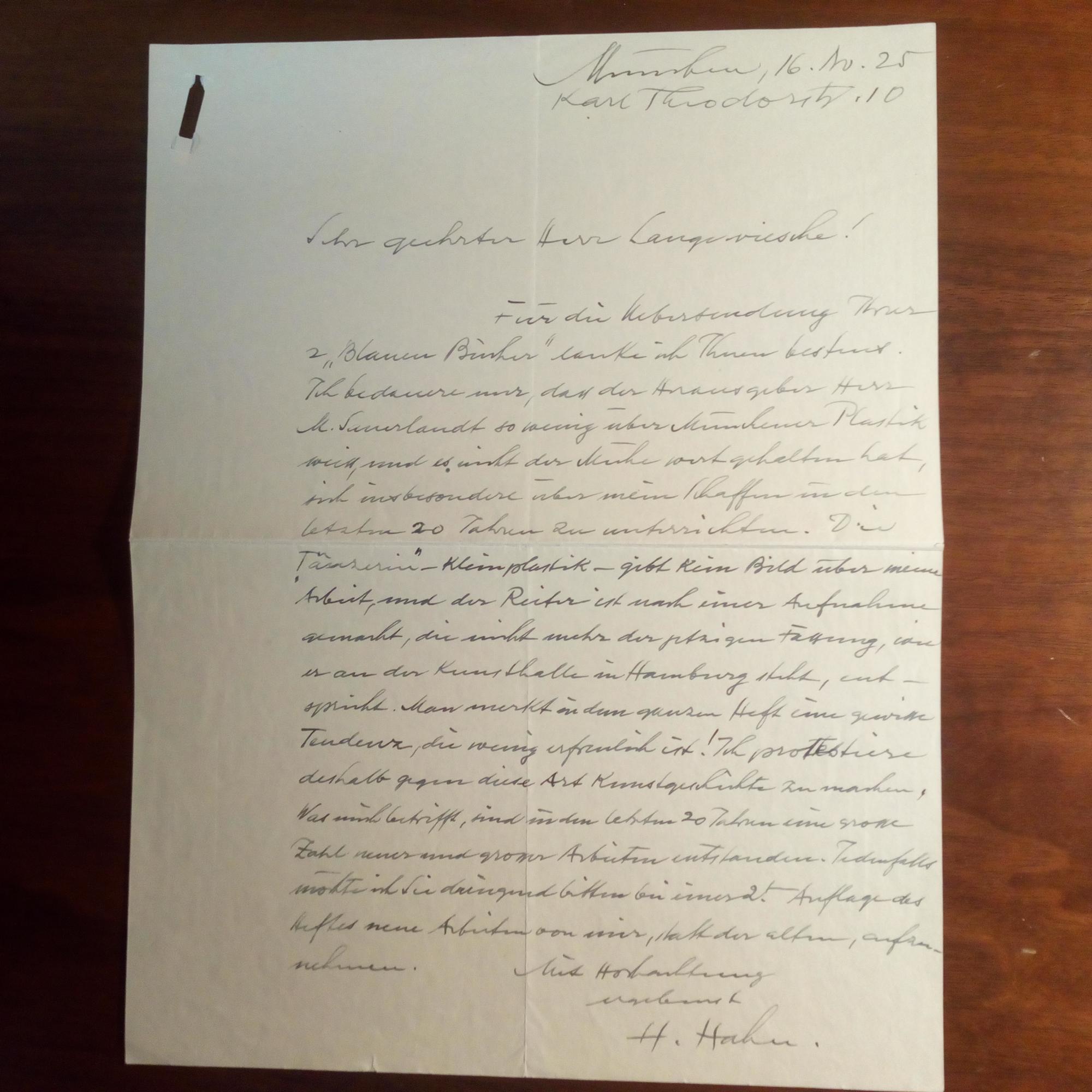 1868-1942, Bildhauer - E. Br. m. U., München 16.11.1925, 1 S. 4°, leichte Gebr.spuren. Dankt für Übersendung der "Blauen Bücher": ...protestiere deshalb gegen die Art Kunstgeschichte zu machen. Was mich betrifft, sind in den letzten 20 Jahren eine grosse Zahl neuer und grosser Arbeiten entstanden... Bittet, diese "statt der alten" in die 2. Auflage aufzunehmen.