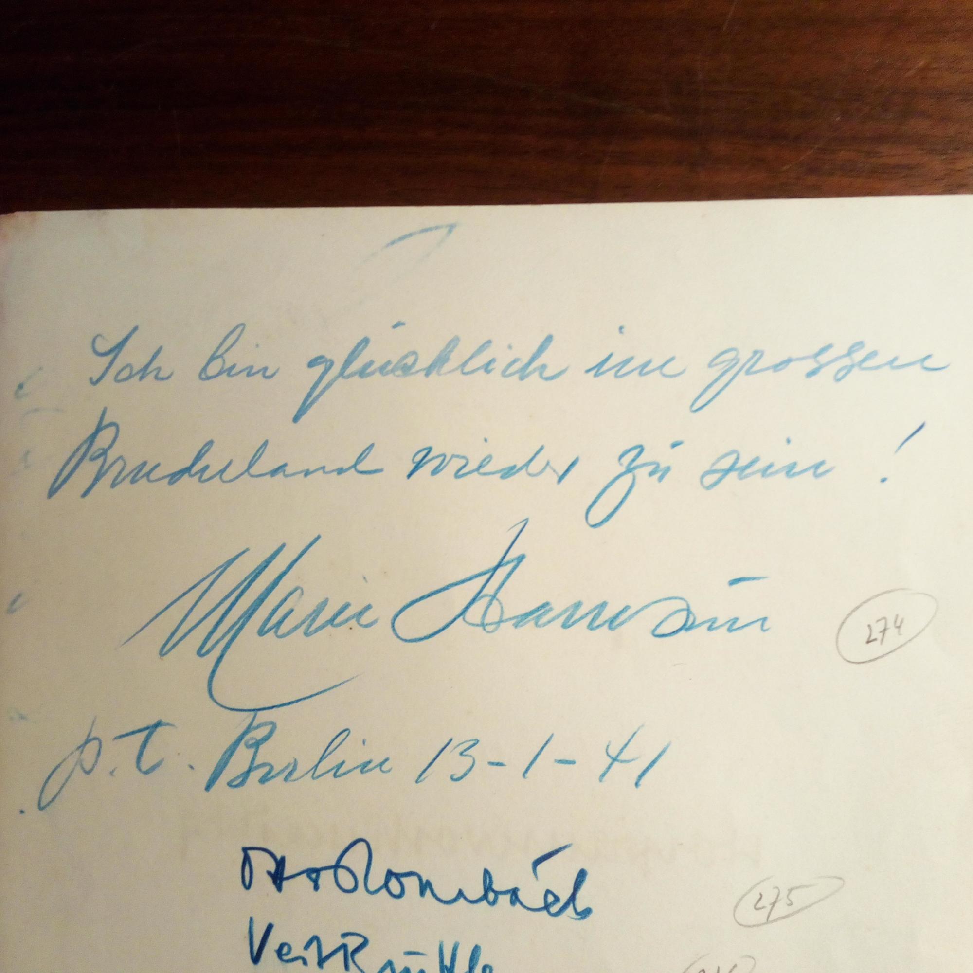 1881-1969, schwed. Schrifts., Gattin von Knut H. - kl.4°-Blatt m. e. Zeilen, U., Berlin 13.1.41, Blaustift. ...bin glücklich im grossen Bruderland wieder zu sein!...". Darunter u. auf Rücks. 10 weitere Einträge, dabei kl. e. Gedicht von Alfred Huggenberger (1867-1960).