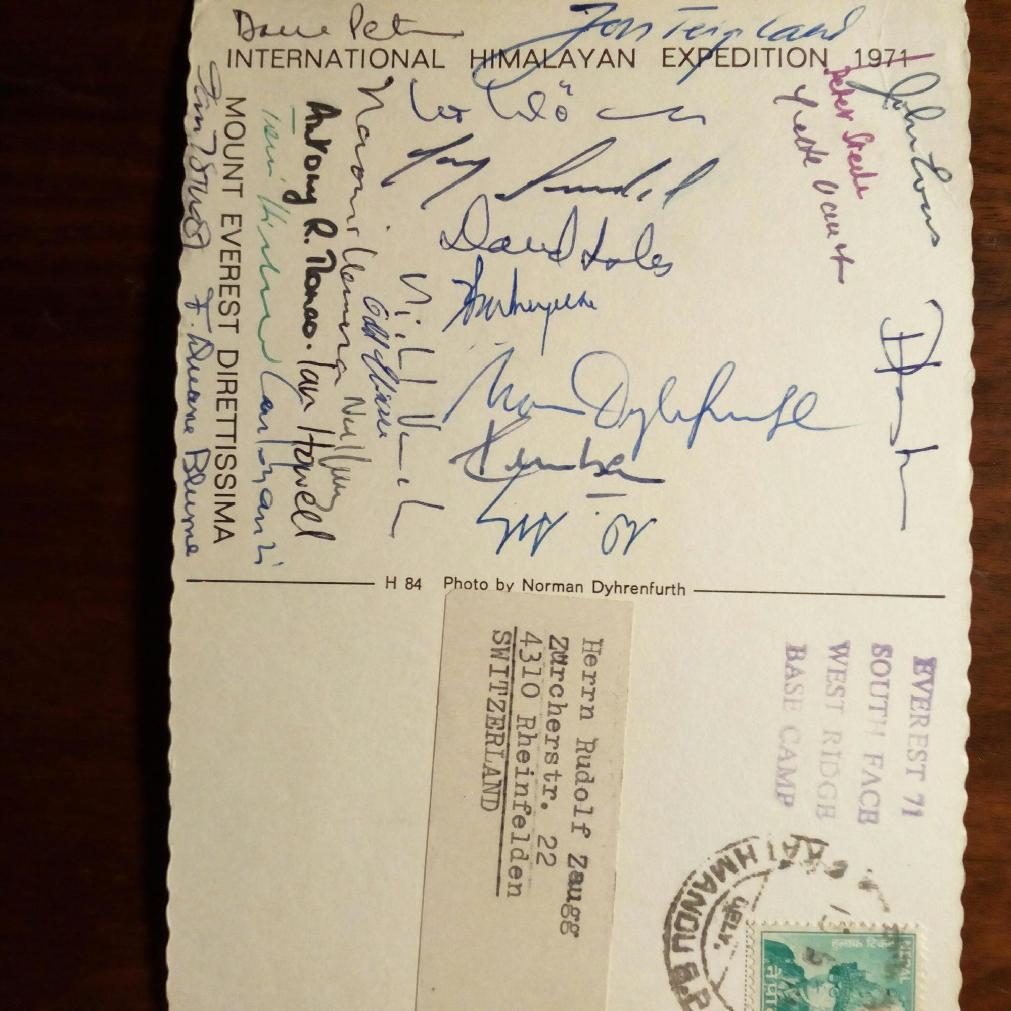 1971: Postal. Ansichtskarte (Mt. Everest) m. den 23 U. der beteiligten Bergsteiger, Stempel des Base-Camps u. Post Kathmandu 13.5.1971. Dabei: Blume, Evans, Howell, Teigland, Strele, Thomas, Clemenza, Aichner...