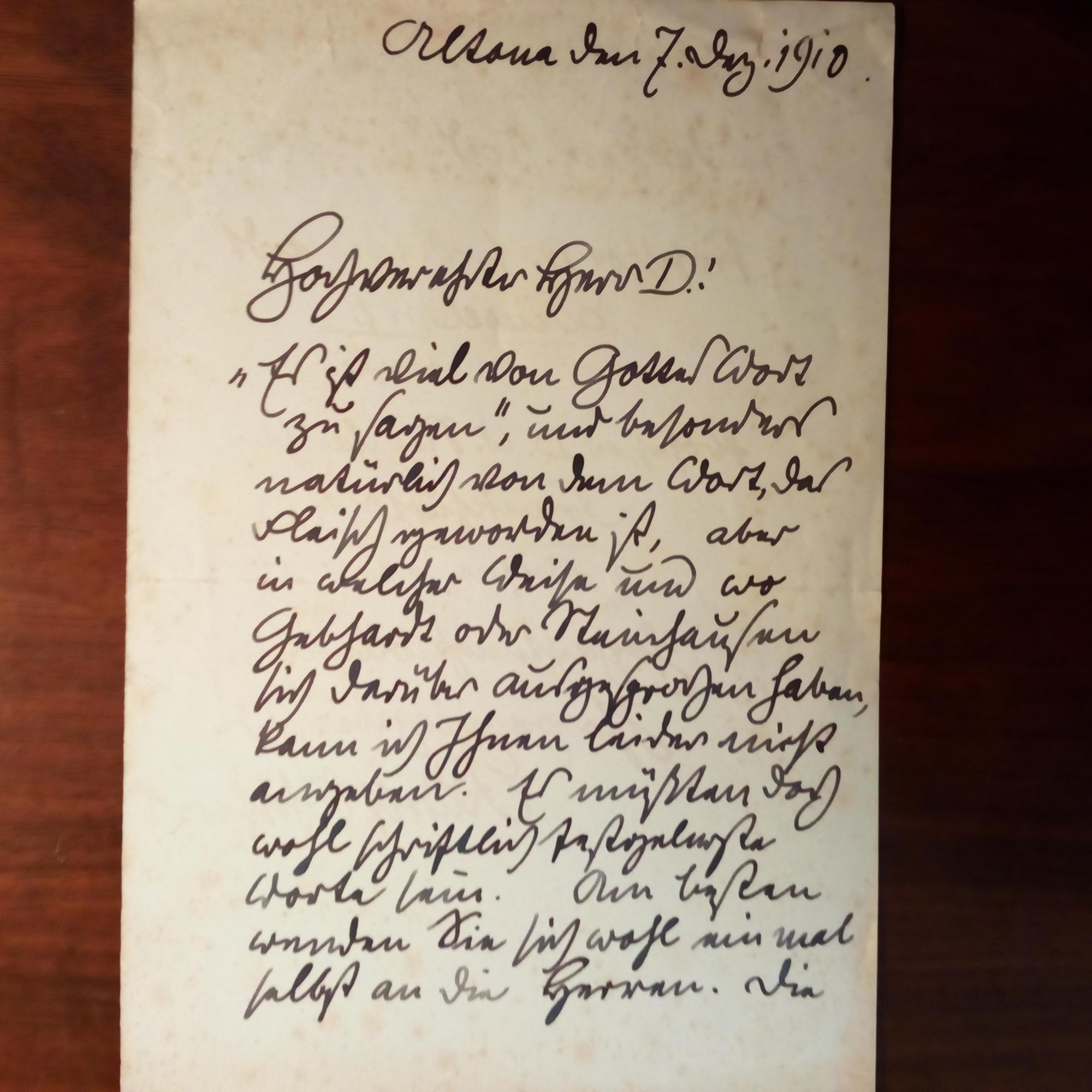1878-1961, Kirchenmaler u. Illustrator - E. Br. m. U., Altona 7.12.1910, 1 ¾ S. 8°, leichte Altersspuren. An "Herrn D." betr. Aussagen der Maler u. Professoren Eduard Karl Franz von Gebhardt und Wilhelm Steinhausen zu "Gottes Wort ... das Fleisch geworden ist...".