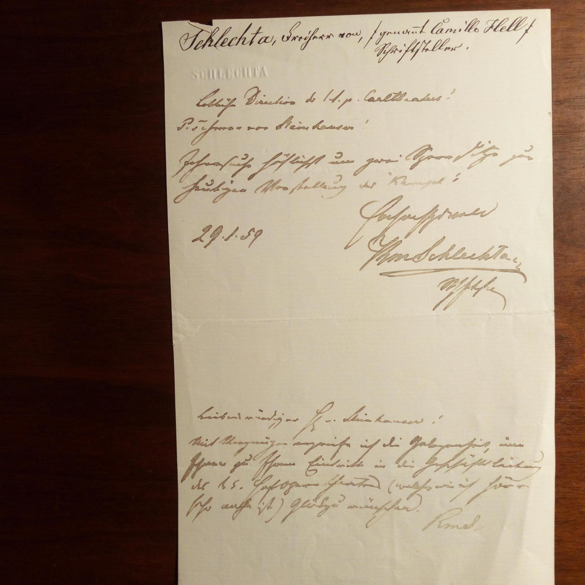 Pseu-donym Camillo Hell, 1822-80, österr. Journalist, Revolutionär und Schriftsteller - E. Br. m. U., (Wien) 29.1.1859, 1 S. 8°, gepr. Name u. Notizen v. and. Hand am Kopf. An den Direktor des Karlstheaters von Steinhausen: bestellt Karten und gratuliert zu einer Beförderung.
