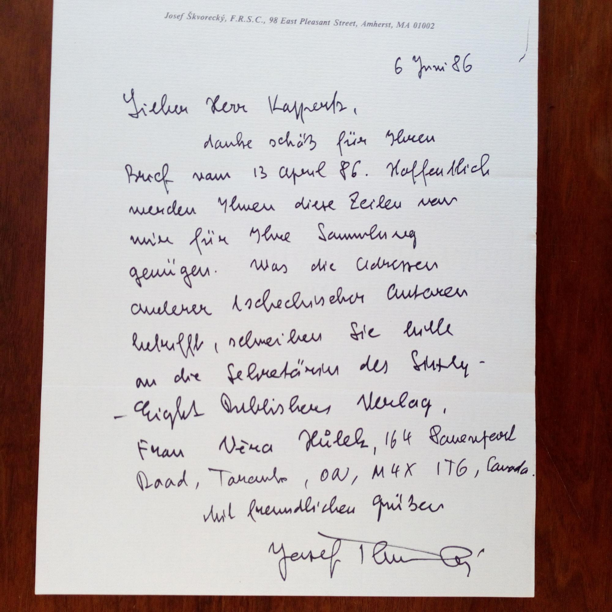 1924-2012, tschech. Schriftst. u. Verleger in Kanada - E. Br. m. U., (Amherst/Mass.) 6.6.1986, 1 S. 4°, Br.kopf, m. e. postal. Umschlag. Dt. Verweist einen Sammler betr. anderer tschech. Autoren in Kanada an den "Sixty Eight Publishers-Verlag" in Toronto.