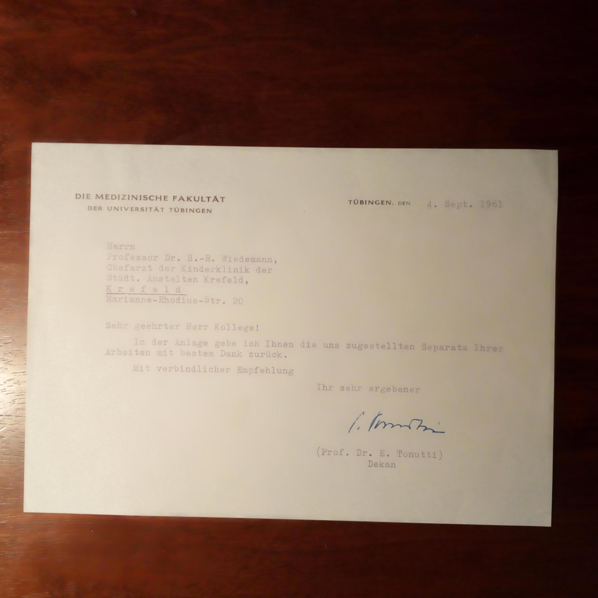 1909-87, Anatom - Br. m. U., (Tübingen) 4.9.1961, 1 S. 8° quer, Briefkopf der med. Fakultät. Schickt dem Kinderarzt Hans-Rudolf Wiedemann (1915-2008) in Krefeld Unterlagen zurück.