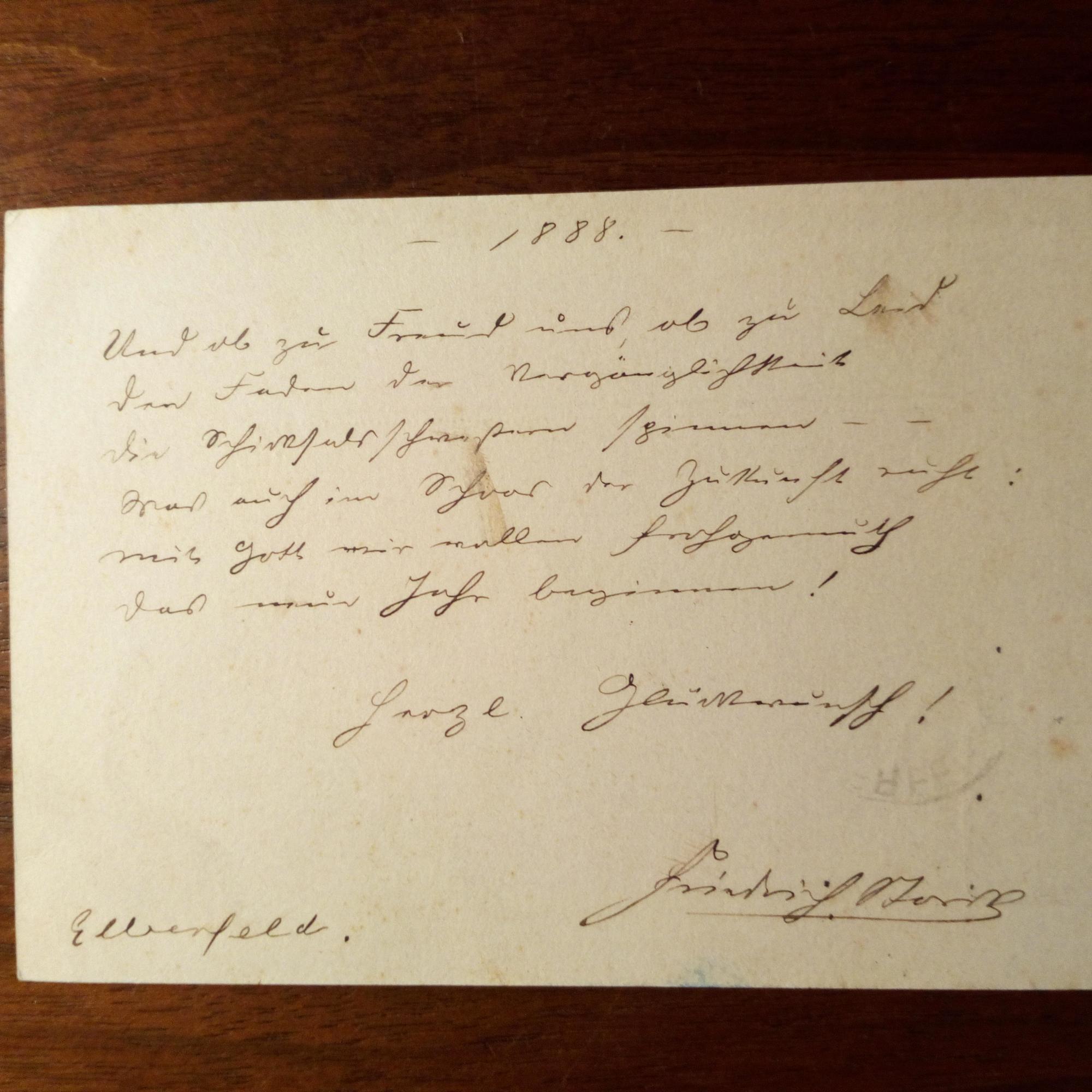 1839-1915, Wuppertaler Dichter - E. postal. Postkarte m. U., Elberfeld (30.12.1887), leichte Gebr.spuren. An den Schriftst., Politiker und Theaterdirektor Eduard Tempeltey (1832-1919) in Coburg: Neujahrswünsche in Gedichtform (7 Z.) m. U.