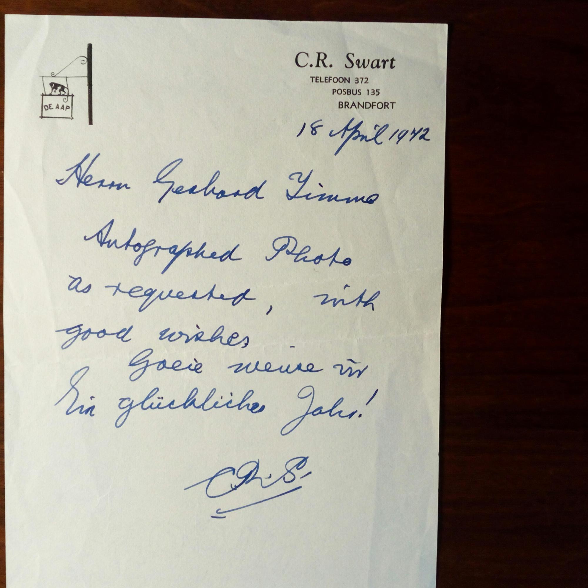 1894-1982, Präsident von Südafrika - E. Kurzbrief m. U. (Monogramm), Brandford 18.4.1972, ca. 1 S. 8°, Br.kopf, Knickspuren. Begleitbrief zu einem signierten Foto (liegt nicht bei) in Englisch, Burisch und Deutsch.