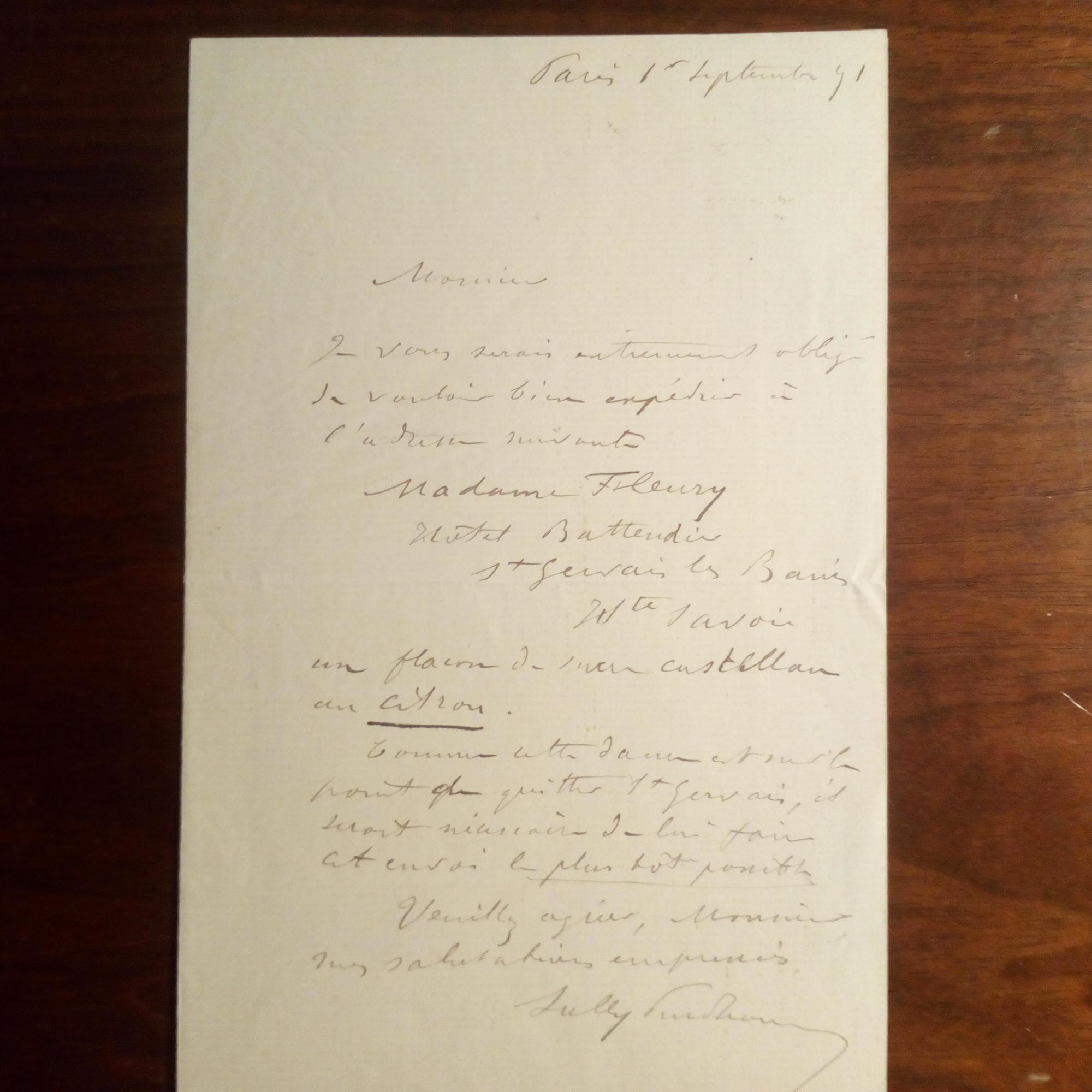 1839-1907, frz. Schriftsteller (erster Nobelpreis für Literatur) - E. Br. m. U., Paris 1.9.1891, 1 S. kl.8°, m. e. postal. Umschl. m. e. Anm. "Pressé". An den Entrepositeur der Fa. Luc Castillan in Paris: Bittet, seiner Freundin Edith Fleury in St. Gervais des Bains "un flacon de mon castellan au citron" zu senden. Dies müsse so schnell als möglich geschehen, da sie St. Gervais demnächst verlassen wolle.