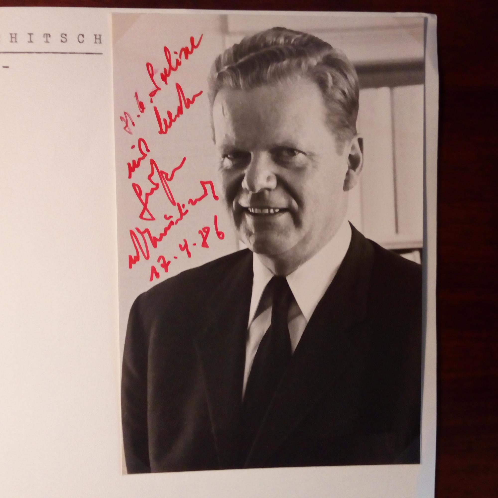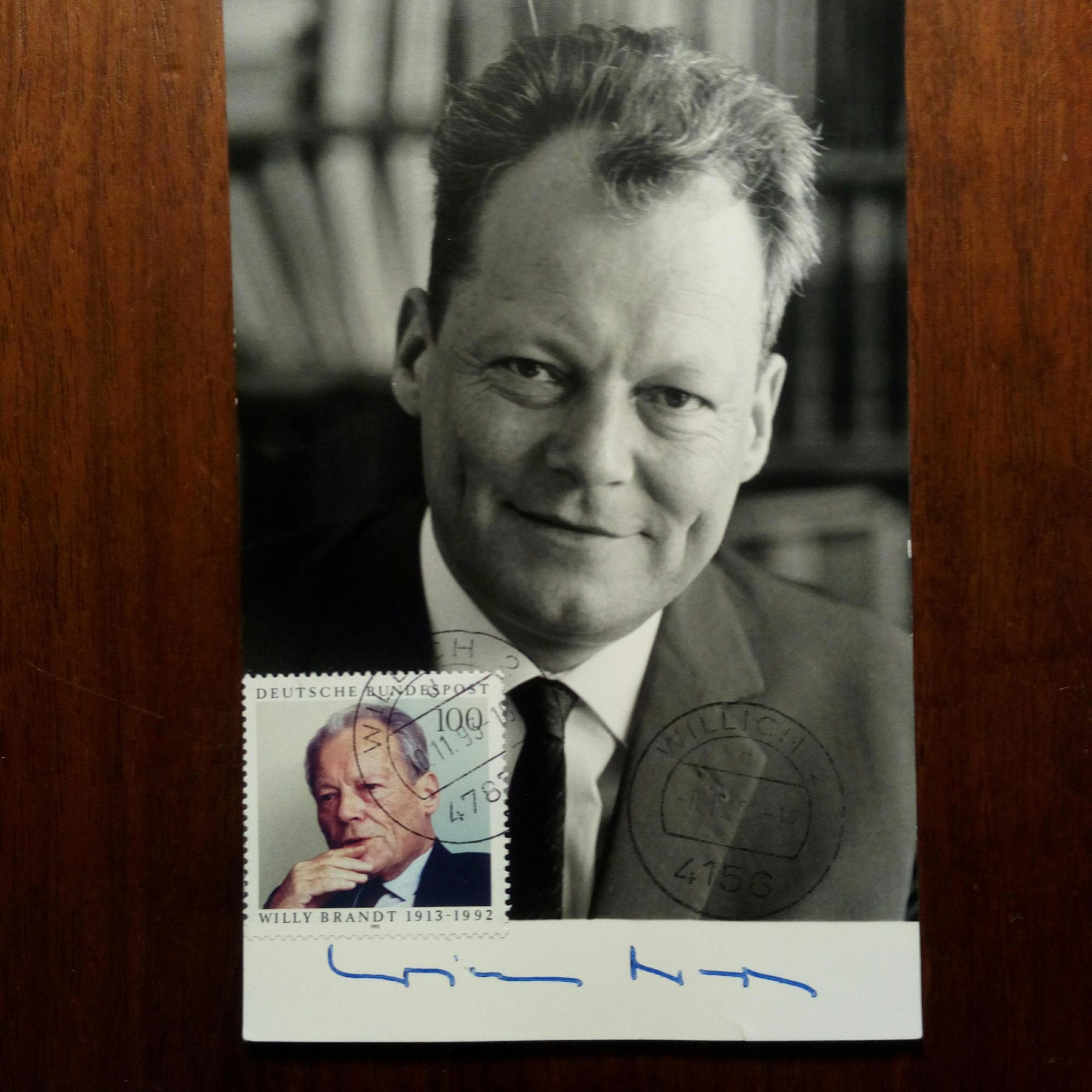 1913-92, Bundeskanzler - schöne SK (zum Friedens-Nobelpreis) m. Pfo. u. Faksimile-U., Bonn 30.1.1973. Auf Rückseite die U. der SPD-Politiker K. Schütz, A. Osswald, W. Brandt, H. Kühn, H. Koschnick, P. Schulz, A. Kubel, C. Schmidt und J. Steffen.