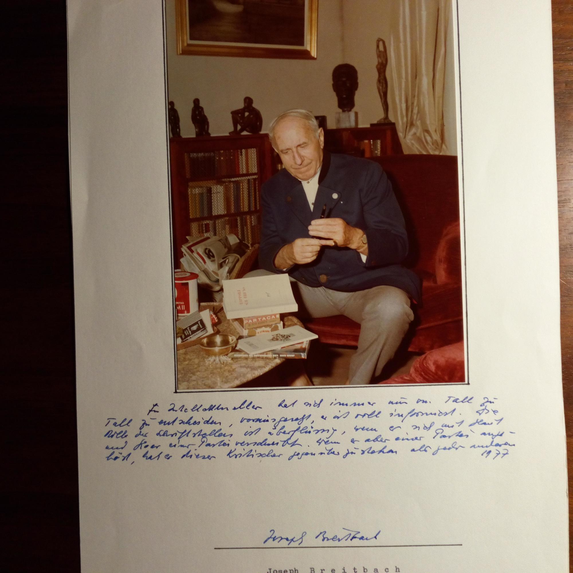 1903-80, Schriftsteller - E. Zitat (über das Verhältnis der Schriftsteller und Intellektuellen zu politischen Parteien), U. u. Jahr 1977 unter auf 4° mont. Hochglanz-Farb-Pfo. (ca. 8°, in seinem Wohnzimmer). Beiliegt Visitenkarte m. e. Dankeszeilen.