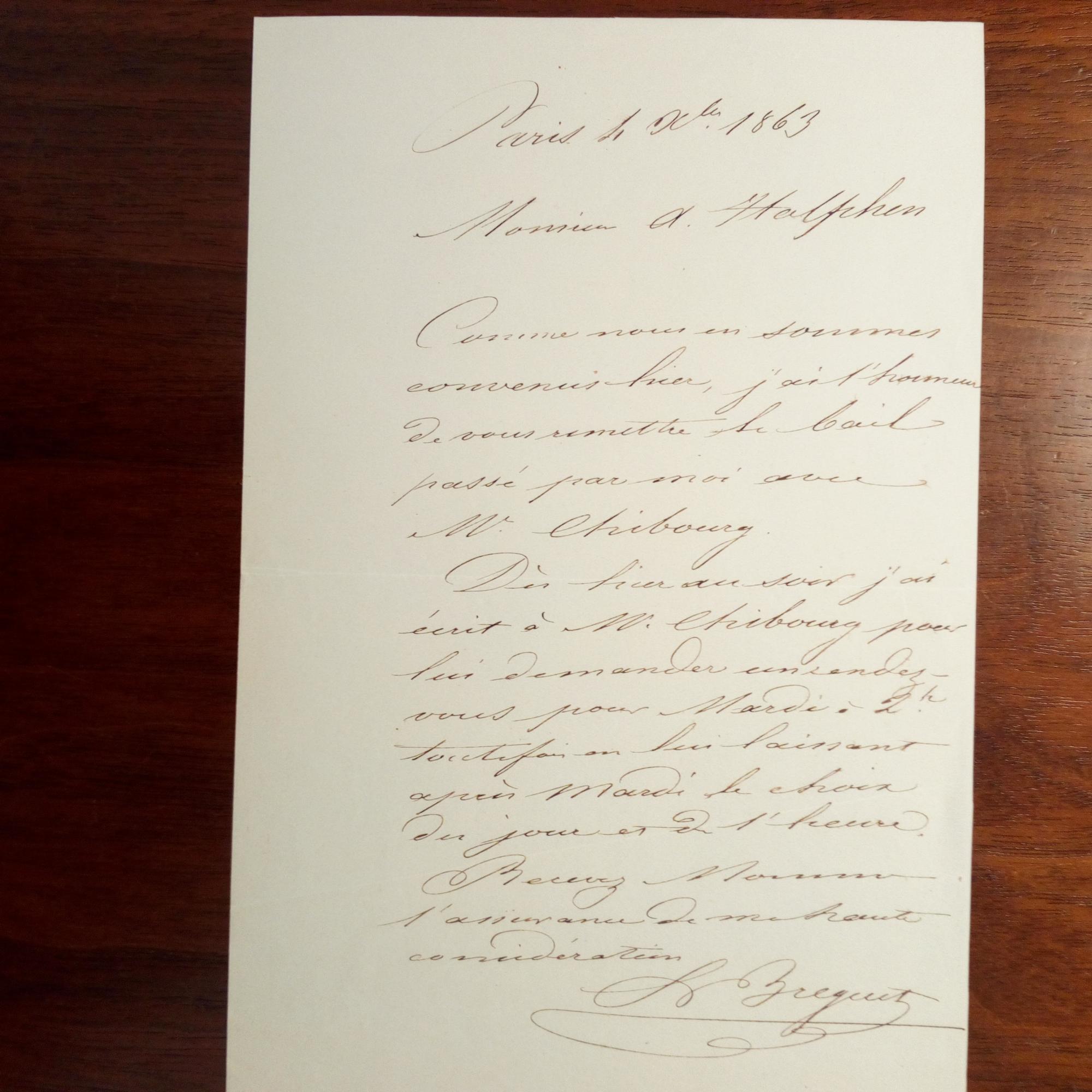 1808-83, frz. Uhrmacher und Erfinder, Sohn des Firmengründers - E. Br. mit U., Paris 1.10.1863, 1 S. 8°. An M. Halfchen: ...j'ai l'honneur de vous remettre le bail passé par moi avec W. Chibourg... Terminvereinbarung. Beiliegt altes Sammlerblatt.