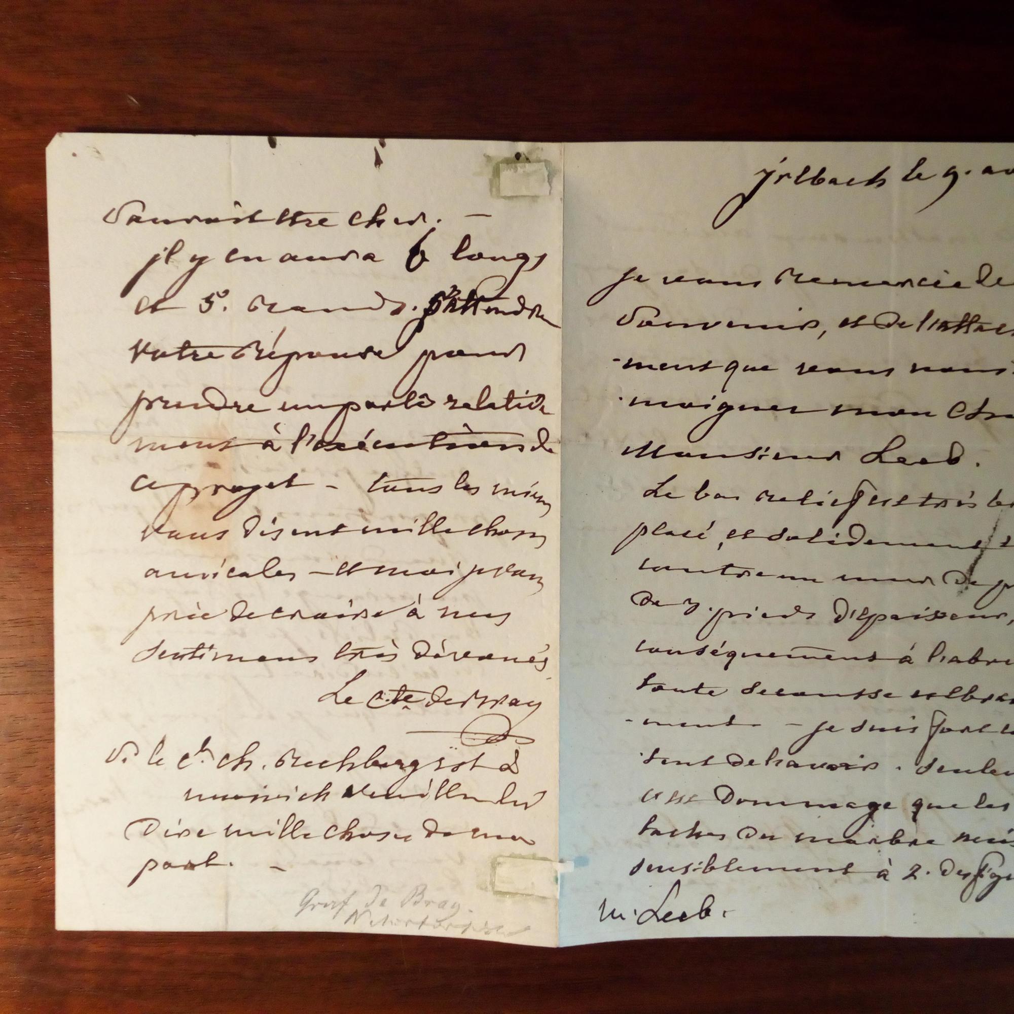 1765-1832, frz. Naturforscher, Diplomat - E. Brief mit U., Irlbach (bei Straubing) 9.8.1827, 4 S. kl. 8°. An den Bildhauer Johannes Leeb (1790-1863) betr. Aufträgen für die Münchner Glyptothek.