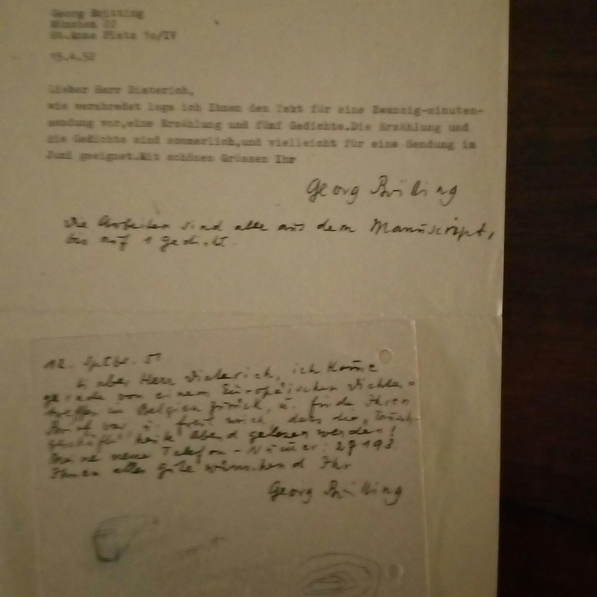 1891-1964, Schriftsteller - 2 Briefe mit U. und e. Ergänzungen, je ½ S. 4° und e. postal. Postkarte mit U., München 1951/52, Bearb.spuren. An den Red, beim Bayerischen Rundfunk Dieterich betr. Lesungen s. Gedichte im Radio. Beiliegen: das e. Gedicht "Gewitter" (5 Str. à 4 Z.) mit U. und e. Korrekturen, und e. ergänzte gedr. Dankkarte.