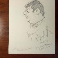 1931-95, kanad. Violonist - 4°-Blatt m. U. unter Bleistift-Porträtzeichnung (Karikatur, signiert Kotrba 14.5.1968).