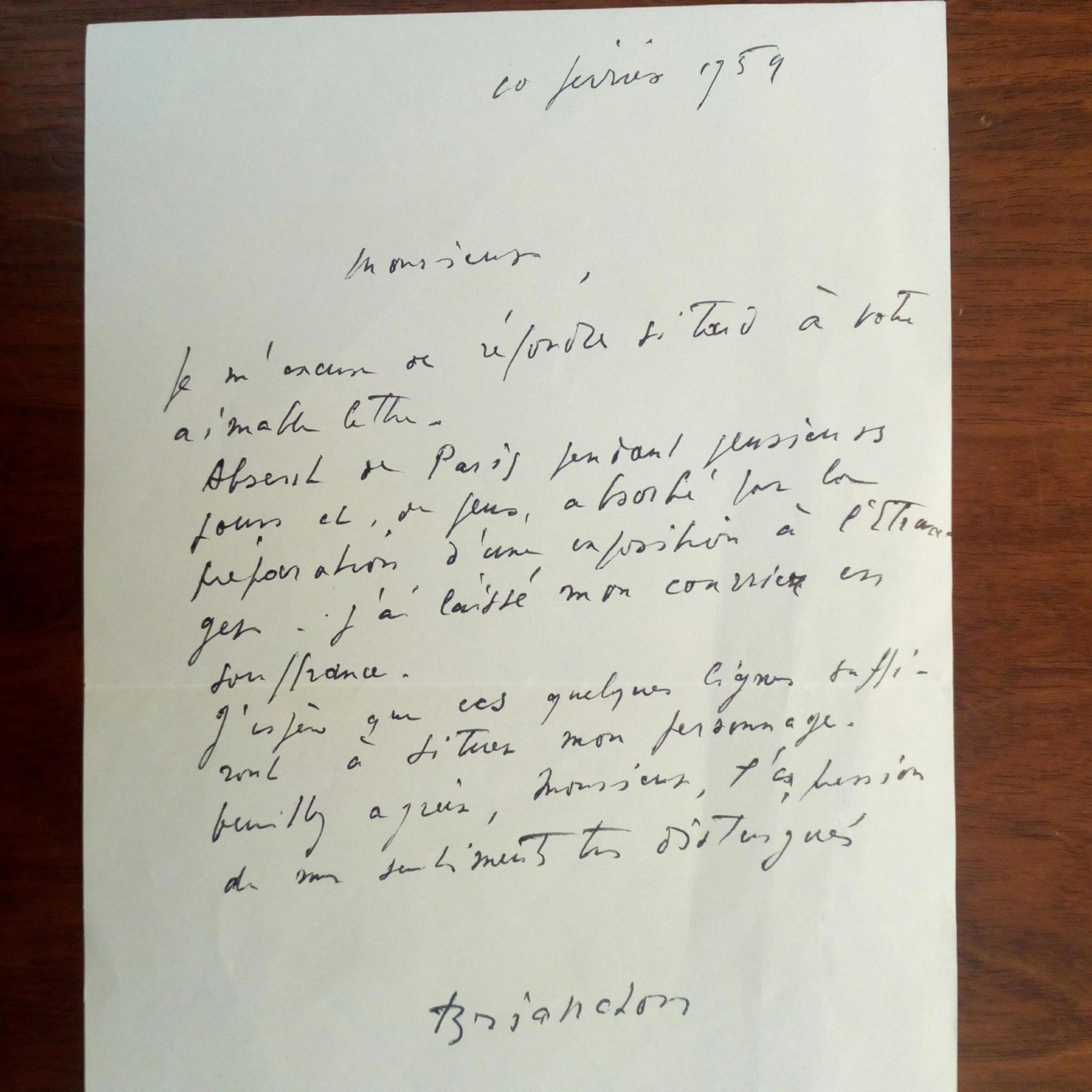 1899-1979, frz. Maler - E. Br. m.U., (Paris) 20.1.1959, ¾ S. 8°, geringe Knitterspuren. An einen Graphologen, u.a.: ...J'espère que quelques lignes suffisont à situer mon personnage...