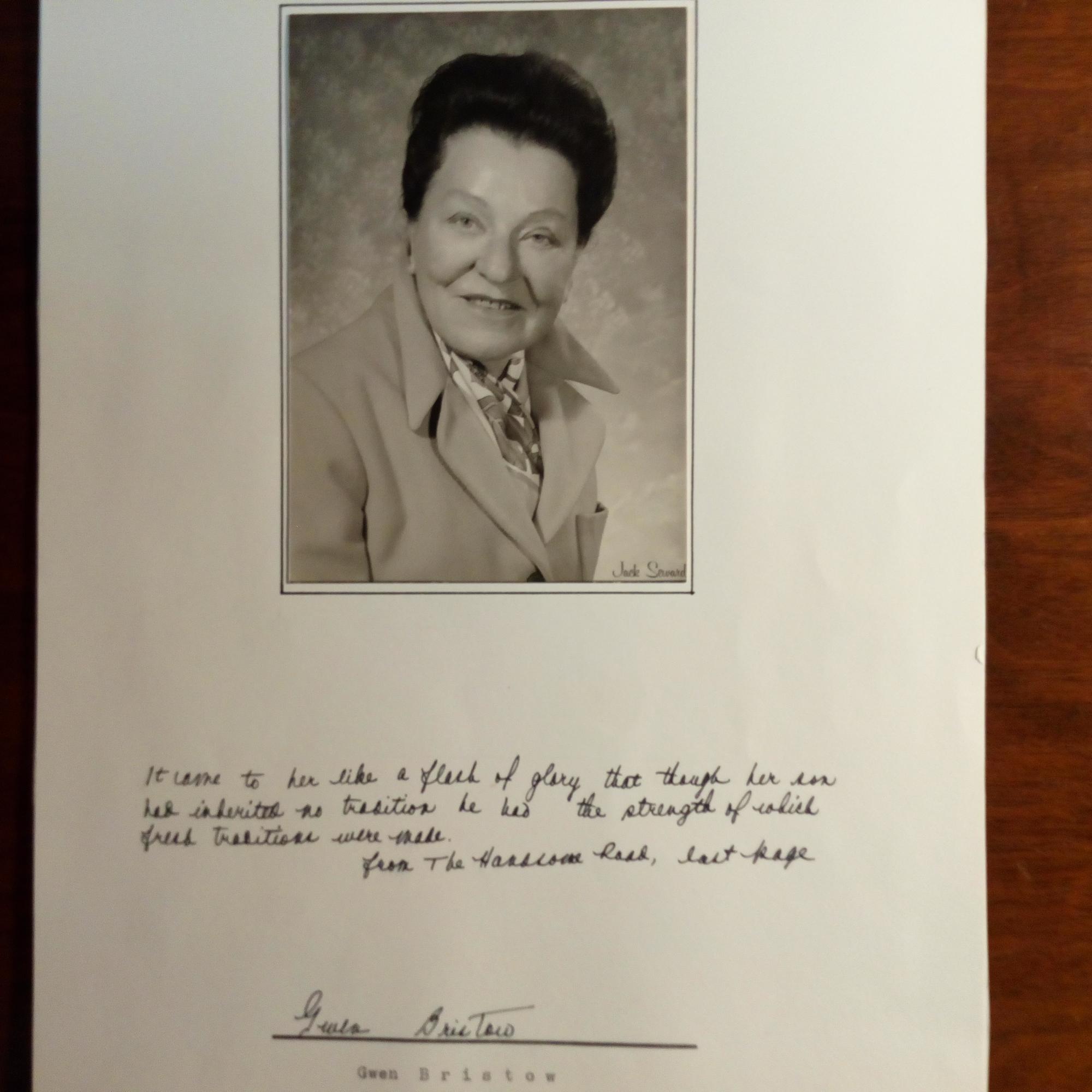 1903-80, US-Schriftstellerin - E. Zitat (3 Z. "from The Handsome Road, last page") u. U. unter auf 4° mont. Pfo. Dazu ausführl. Begleitbr. m. U., Encina Cal. 20.6.1979, 1 S. 4°.