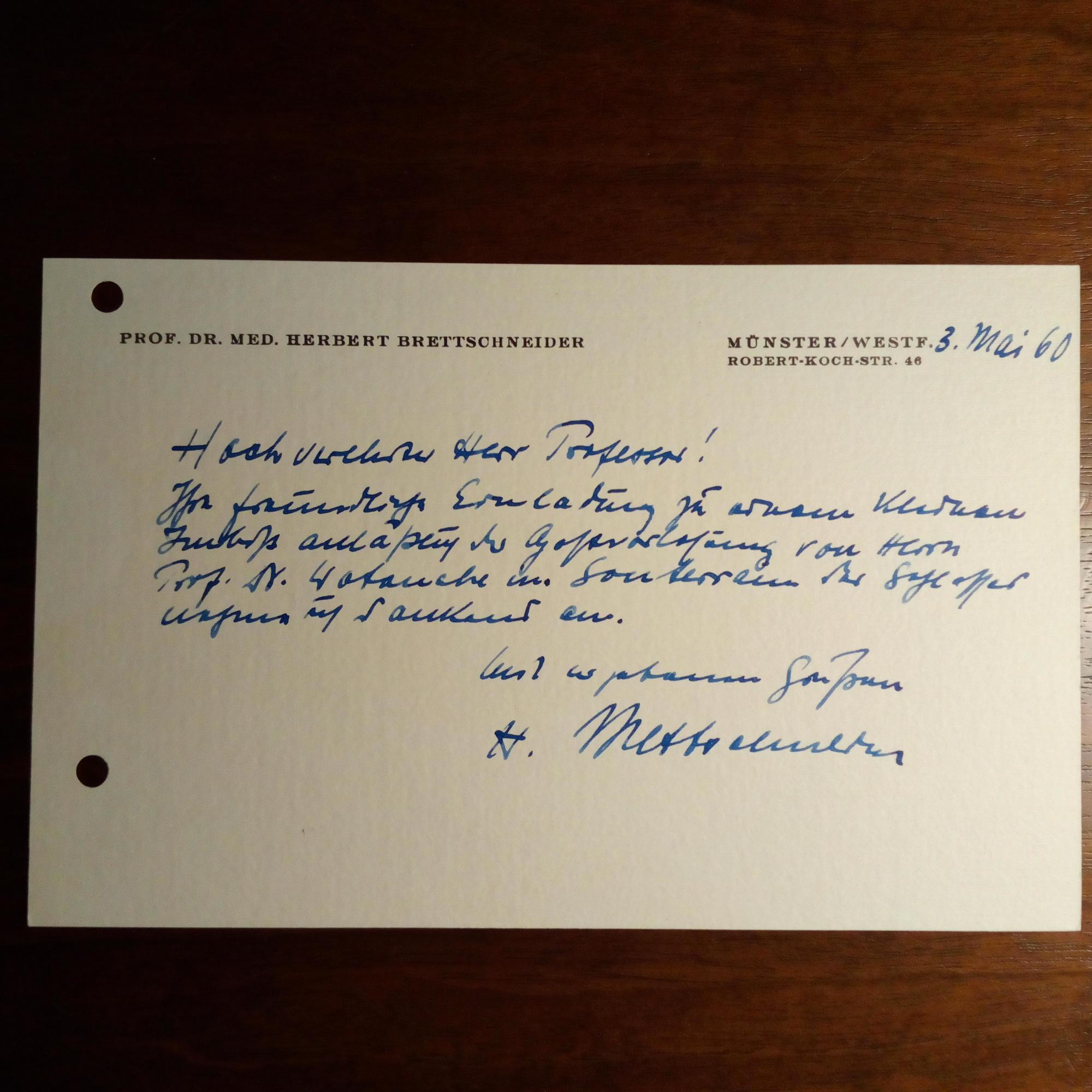1914-2004, Anatom - E. Br.karte m. U., (Münster) 3.5.1960, 1 S. quer, Br.kopf, gel. Die Einladung eines Kollegen anläßl. einer Gastvorlesung eines and. Kollegen zu einem Imbiß "im Souterrain des Schlosses" nimmt er gerne an.