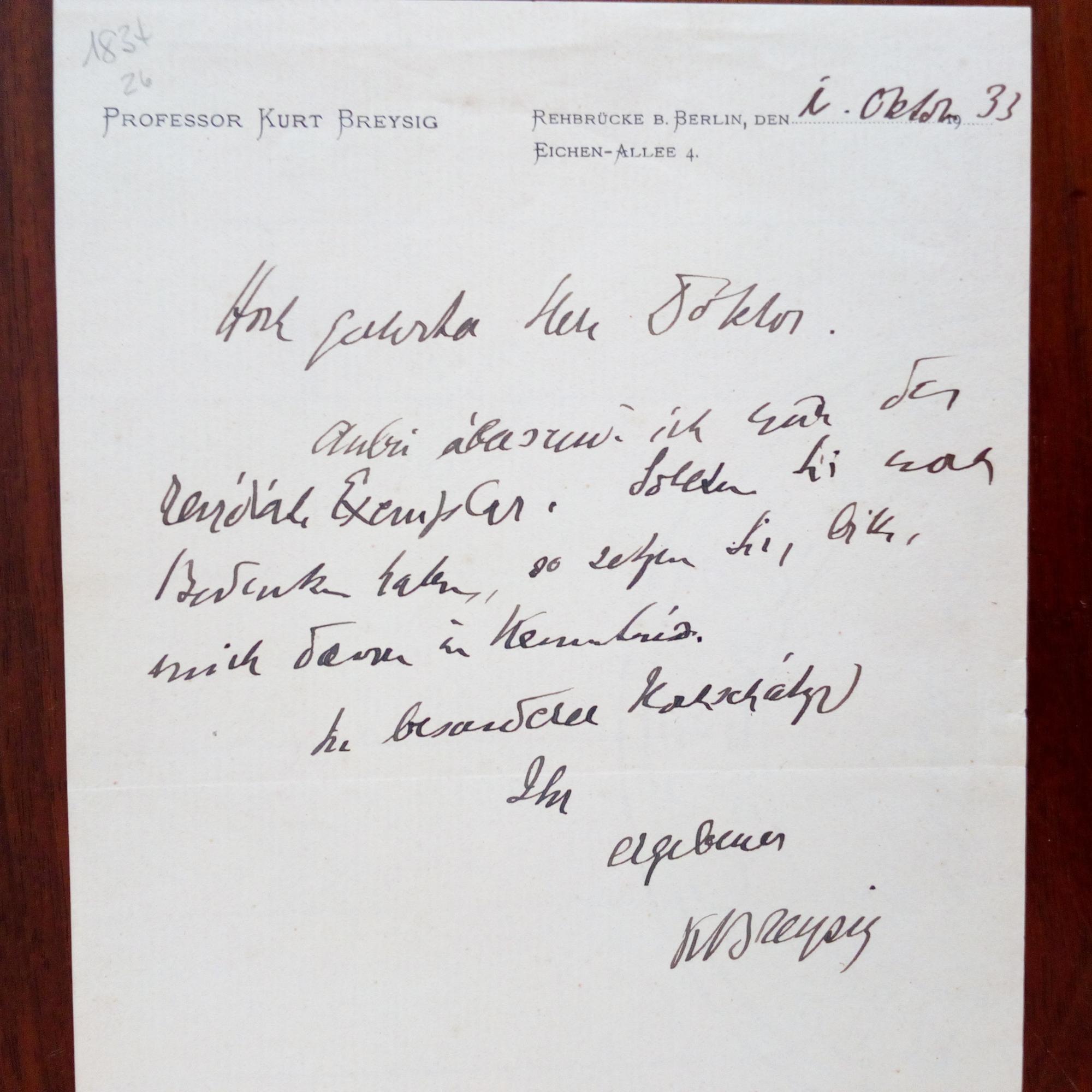 1866-1940, Historiker - E. Brief mit U., (Rehbrücke bei Berlin) 1.10.1933, ½ S. 8°, Briefkopf. An "Herrn Doktor": ...übersende ich das rezidierte Exemplar. Sollten Sie noch Bedenken haben... Beiliegt e. Kurzbrief mit U. an eine Dame