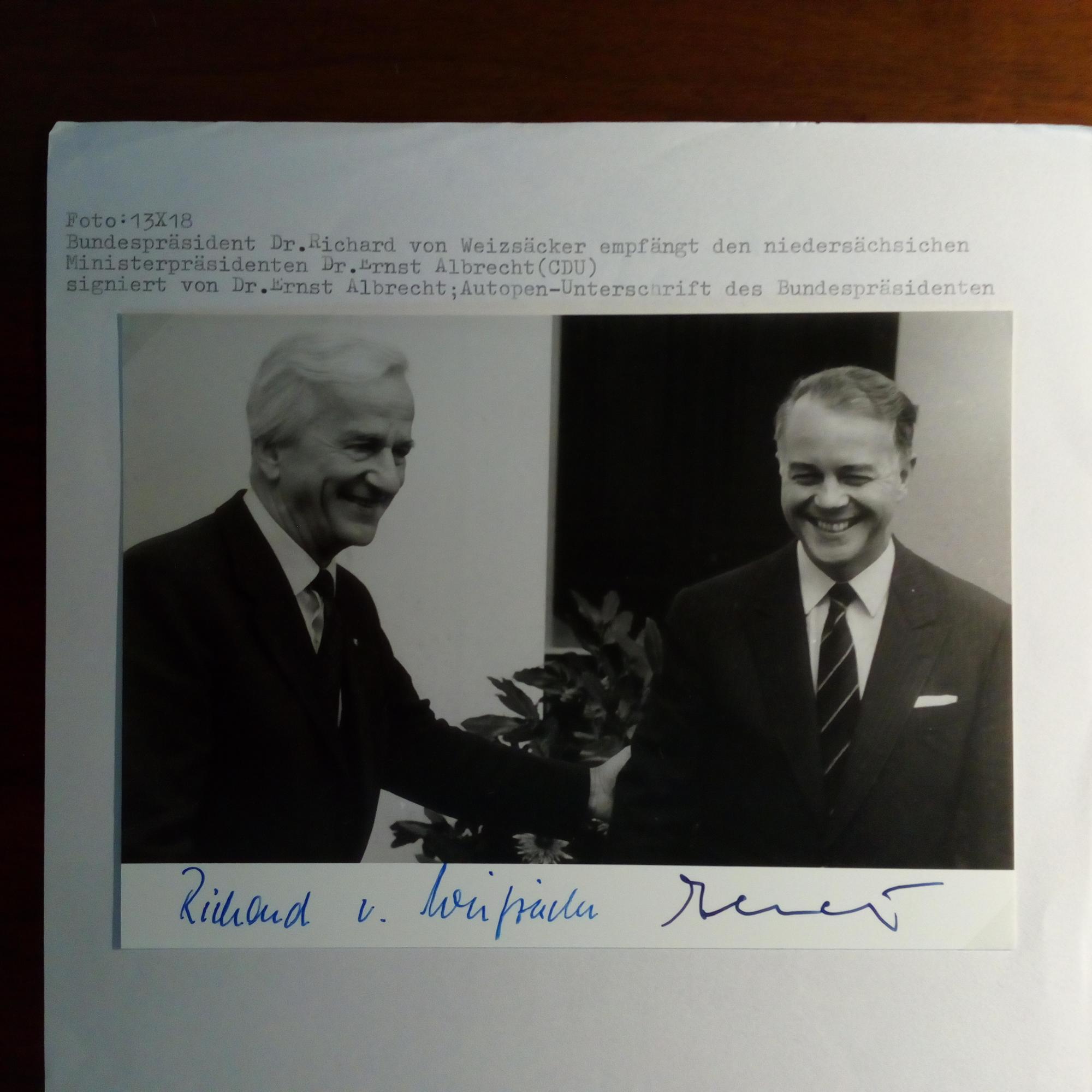 1930-2014, CDU-Politiker, Ministerpräsident von Niedersachsen - Farb-Pfo. m. Widm. u. U. Beiliegen: Je 8°quer-Foto m. seiner U.: m. H. Kohl, R. von Weizsäcker (von diesem Autopen-U.) und je m. eigh. U. von Karl Carstens und Philipp Jenninger.